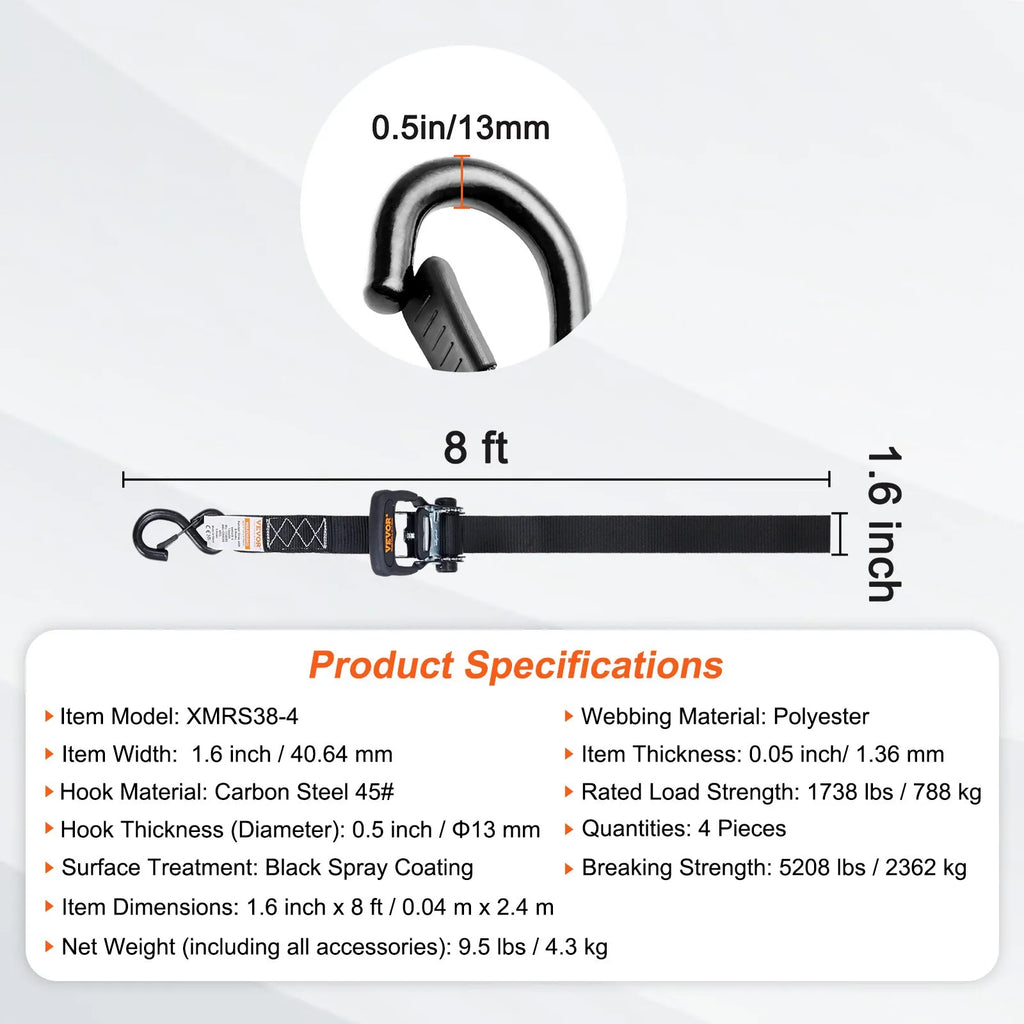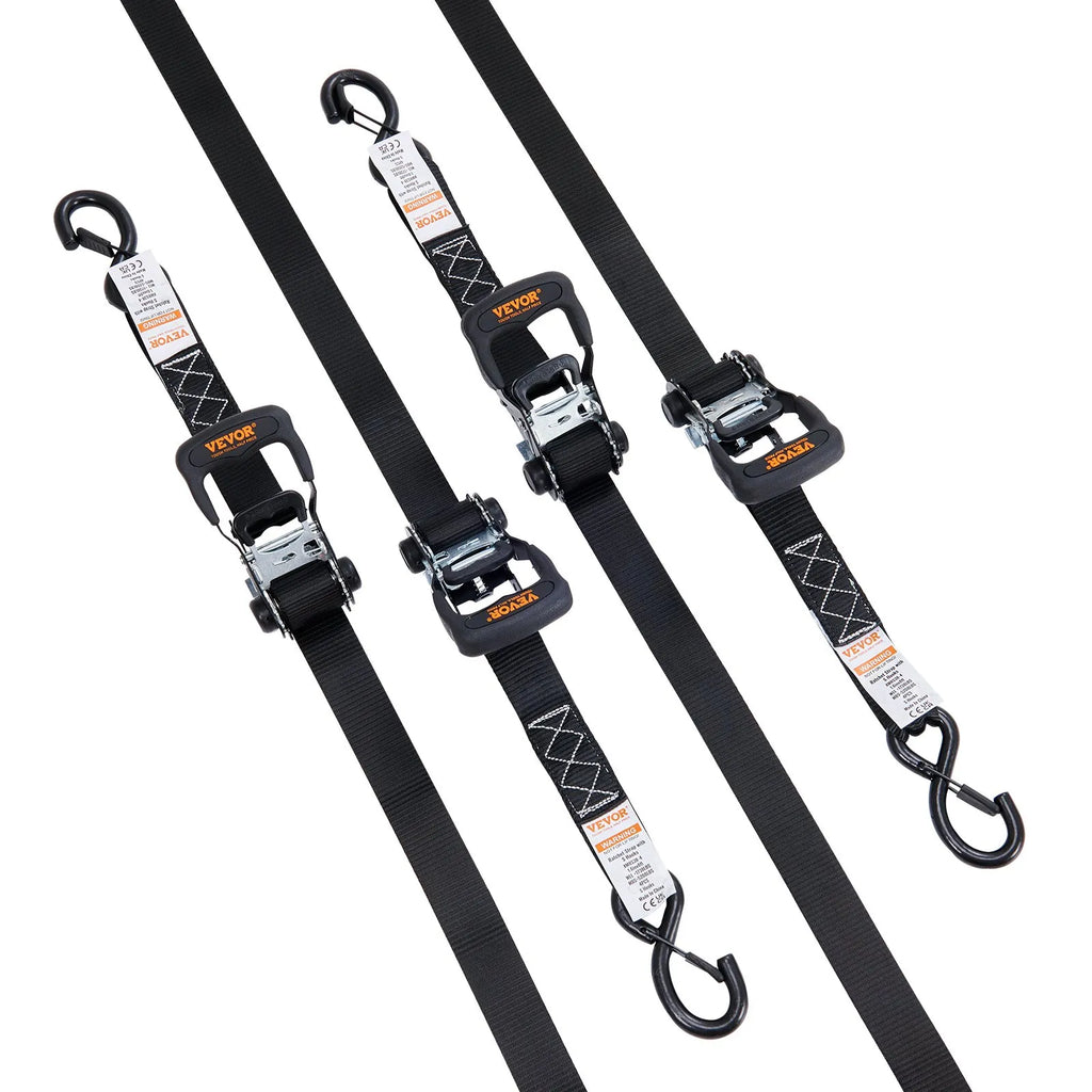 VEVOR sprūdrata stiprināšanas siksnas tiek piedāvātas 4 gabalu komplektā. Katra siksna ir 40 mm plata un 2,44 m gara. Komplektā iekļautas polsterētas rokturu daļas un atsperu āķi, kas uzlabo lietošanas ērtumu un veiktspēju. Siksnas ir ievietotas ērtā uzglabāšanas somā, lai tās būtu vienmēr sakārtotas un gatavas lietošanai.