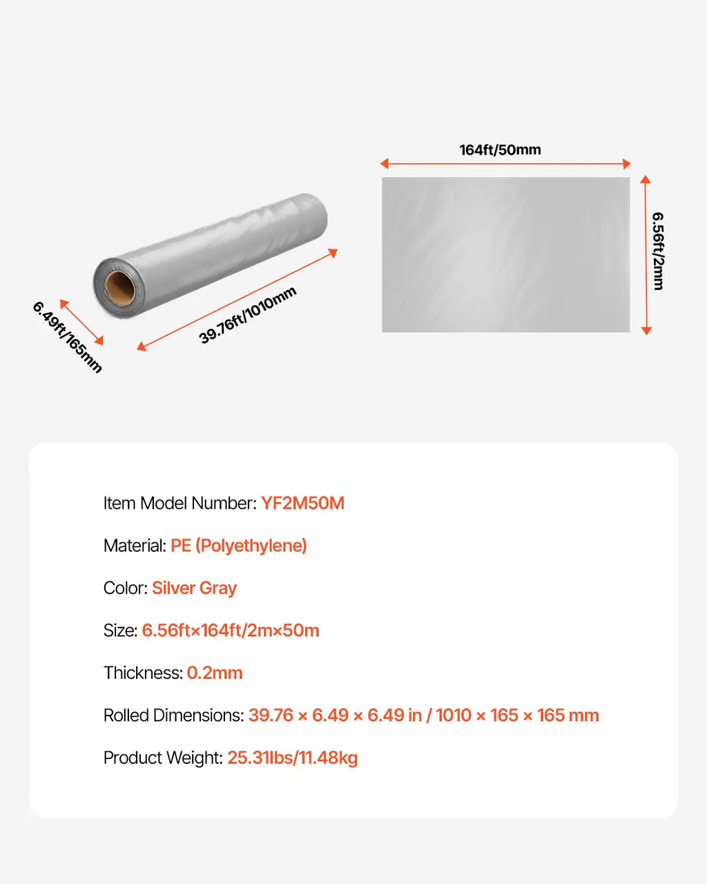 0,2 mm biezā plastmasas plēve ir izturīga pret plīsumiem sprieguma ietekmē. Lielais izmērs — 2 x 50 m — nodrošina plašu pārklājumu jebkuram projektam. Pelēkā plēve efektīvi bloķē saules gaismu, novēršot nezāļu augšanu, un ir noturīga pret dažādiem laikapstākļiem. Piemērota nezāļu kontrolei, žogu aizsardzībai un izolācijai.