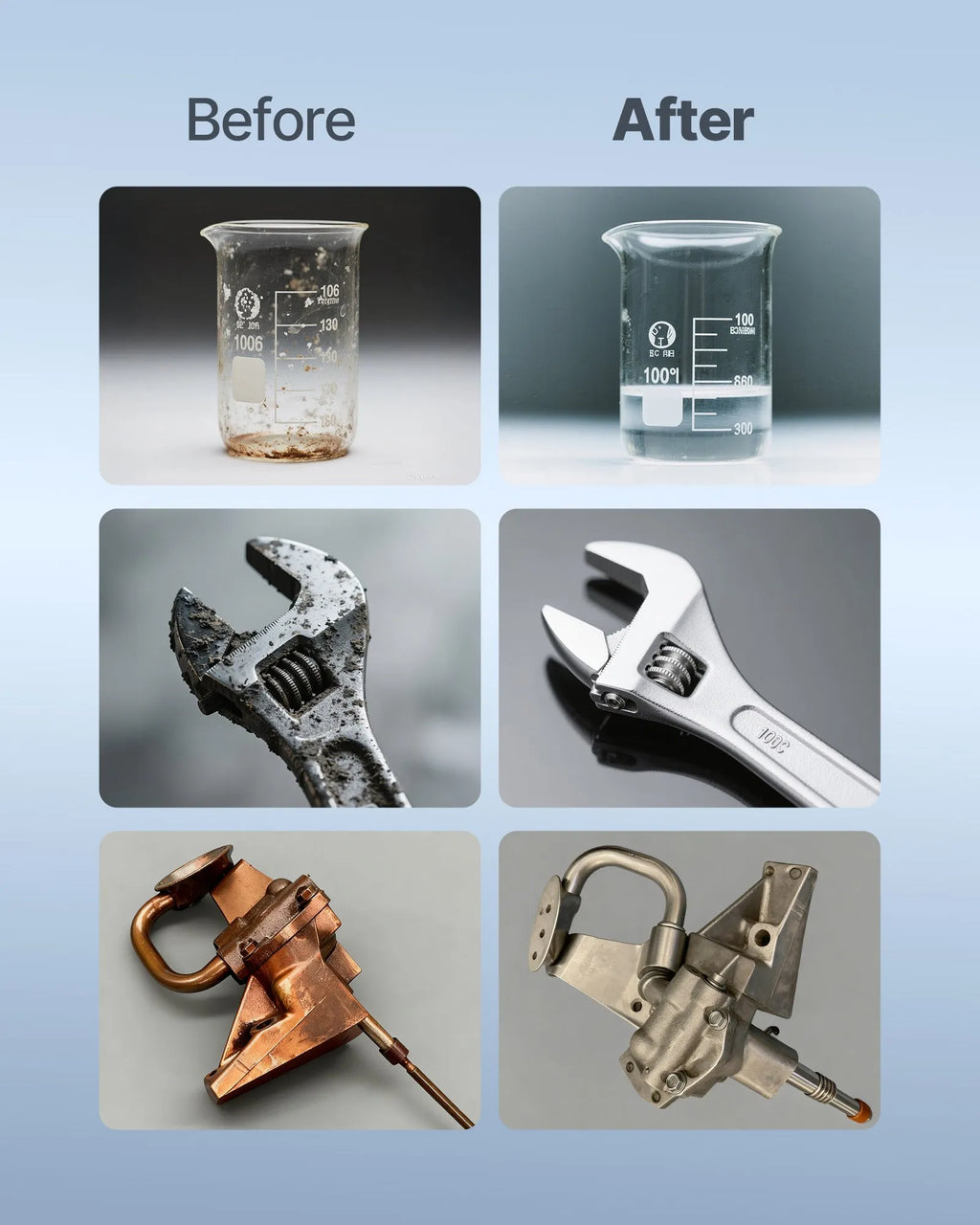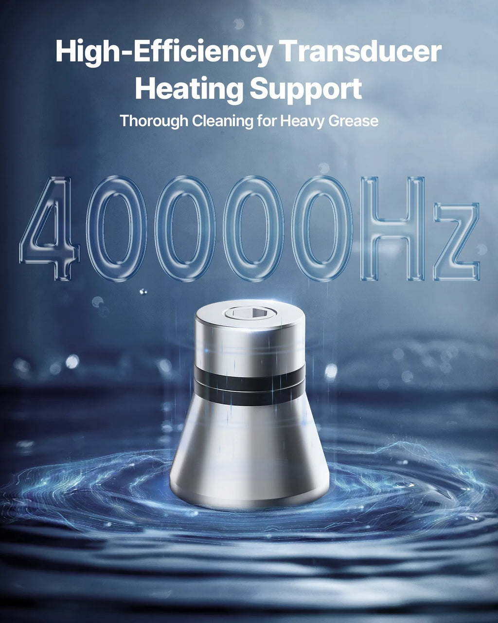 Jaudīga tīrīšana: 40 kHz ultraskaņas viļņi rada mikroburbuļus, kas ātri noņem eļļas un daļiņas no grūti pieejamām vietām, piemēram, karburatoriem, smidzināšanas sprauslām un sīkām detaļām. Optimāliem rezultātiem lietot ar neitrālu mazgāšanas līdzekli un siltu ūdeni.