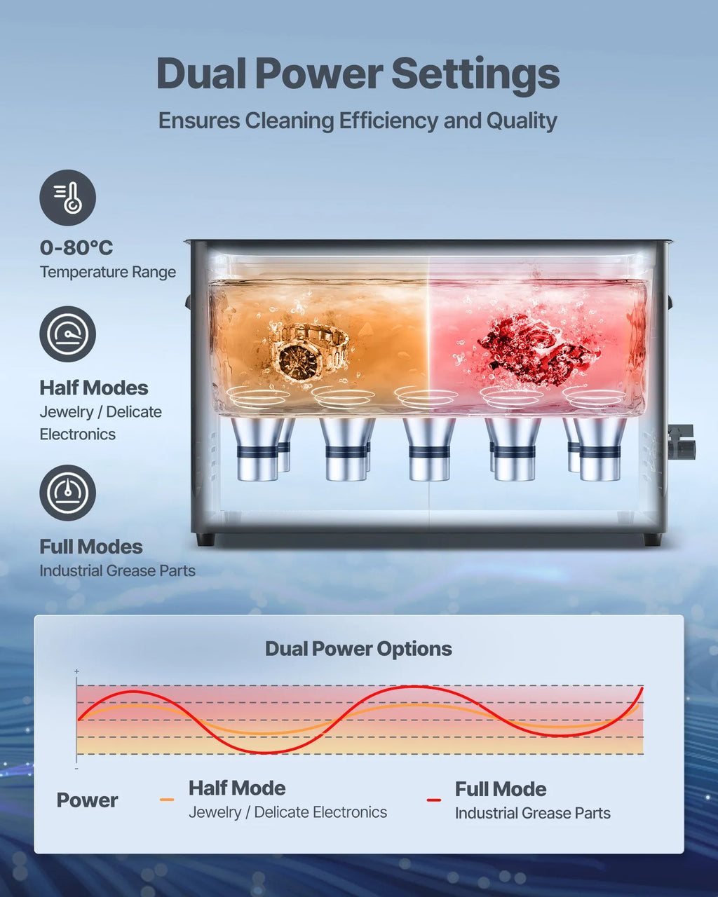 Divi jaudas režīmi: Šī ultraskaņas tīrītāja degazācijas režīms izvada gaisu no šķidrumiem, palielinot tīrīšanas efektivitāti par 30 %. Divi jaudas iestatījumi nodrošina precīzu tīrīšanu gan trausliem priekšmetiem, gan izturīgām detaļām bez bojājumiem.