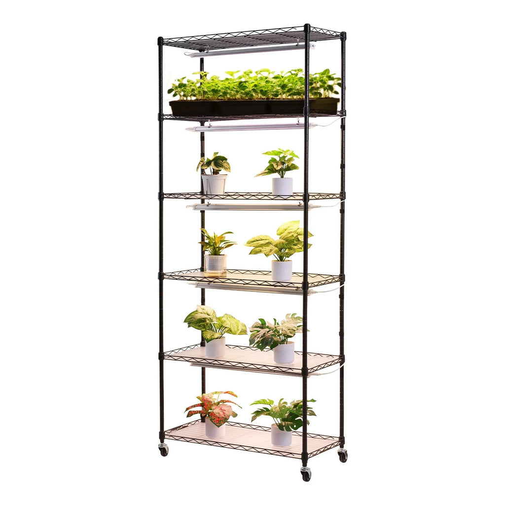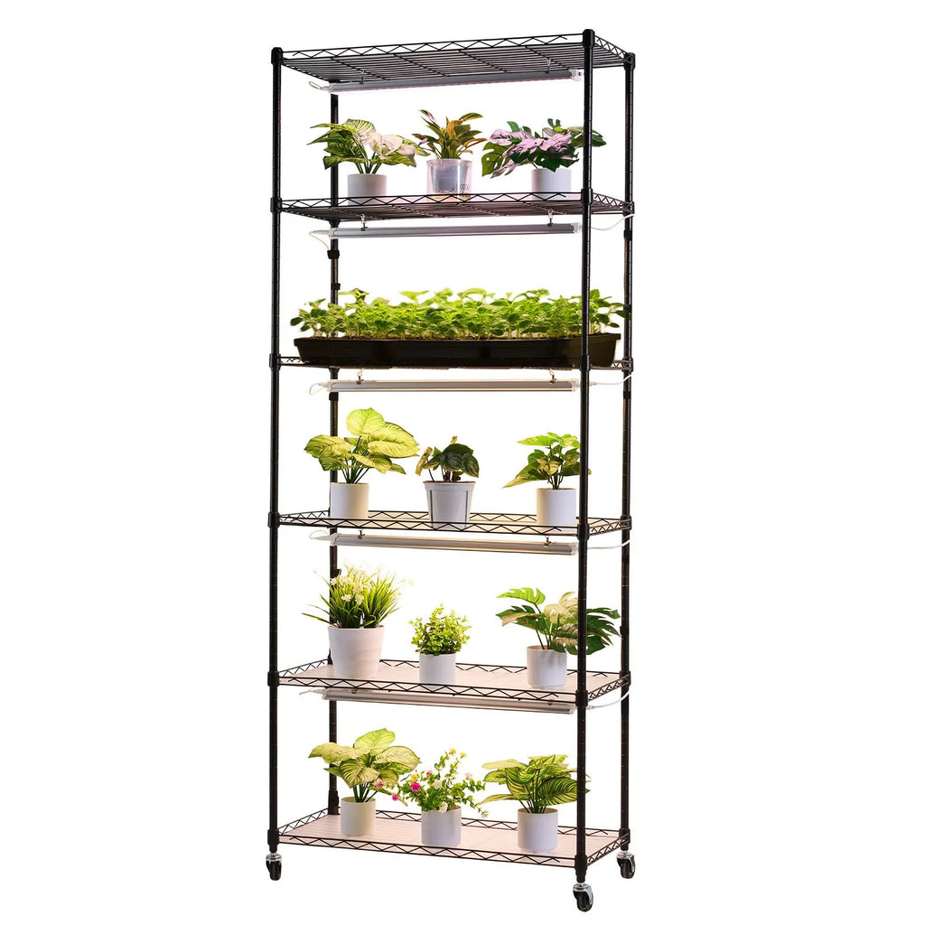 6 līmeņu augu statīvs: 180 cm augstais augu statīvs ar 6 plašiem plauktiem ir ideāli piemērots iekštelpu augu audzēšanai vai izvietošanai. Tas nodrošina vietu ziediem, dīgstiem, mikrozaļumiem un dārzeņiem — bez nepieciešamības pārvietot augus ārā saules gaismā.