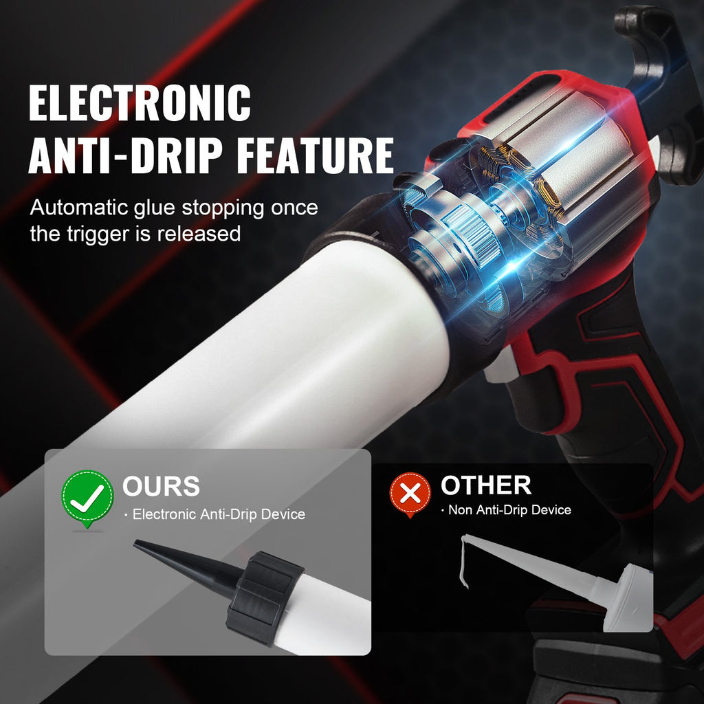 VEVOR bezvadu hermētiķa pistole ar lielu ietilpību – 600 ml – ir piemērota akrila, līmvielu, butila hermētiķu un citu blīvēšanas materiālu uzklāšanai. Piemērota ikdienas šuvju aizpildīšanai, hermetizēšanai un blīvēšanai.