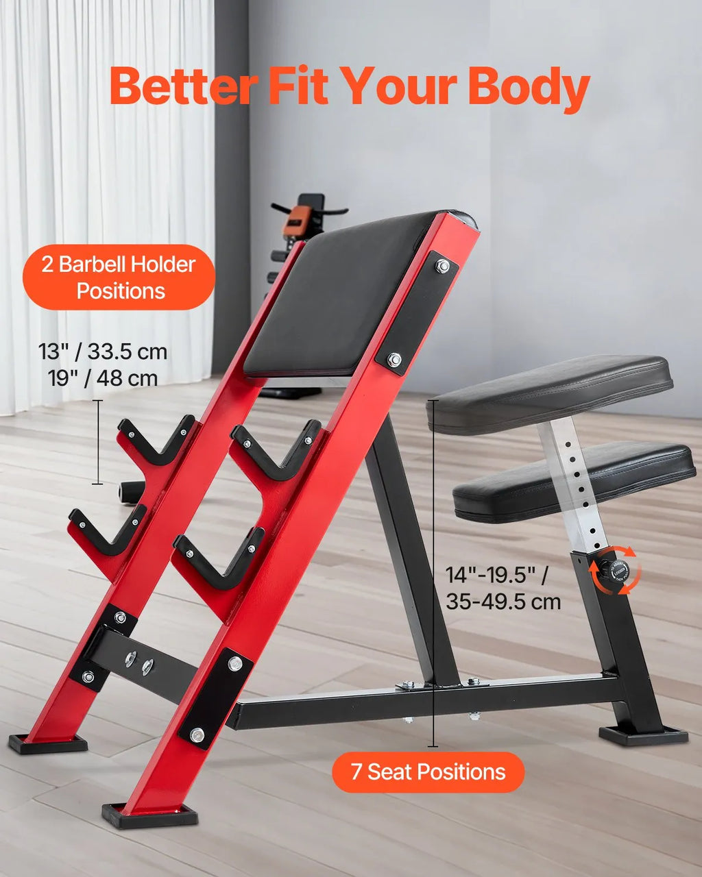 Aprīkots ar 7 sēdekļa pozīcijām un 2 stieņa turētāju pozīcijām, kas ļauj precīzi pielāgot trenažieri dažādiem lietotājiem. Piemērots gan iesācējiem, gan pieredzējušiem sportistiem, nodrošinot pareizu ķermeņa novietojumu un komfortu.