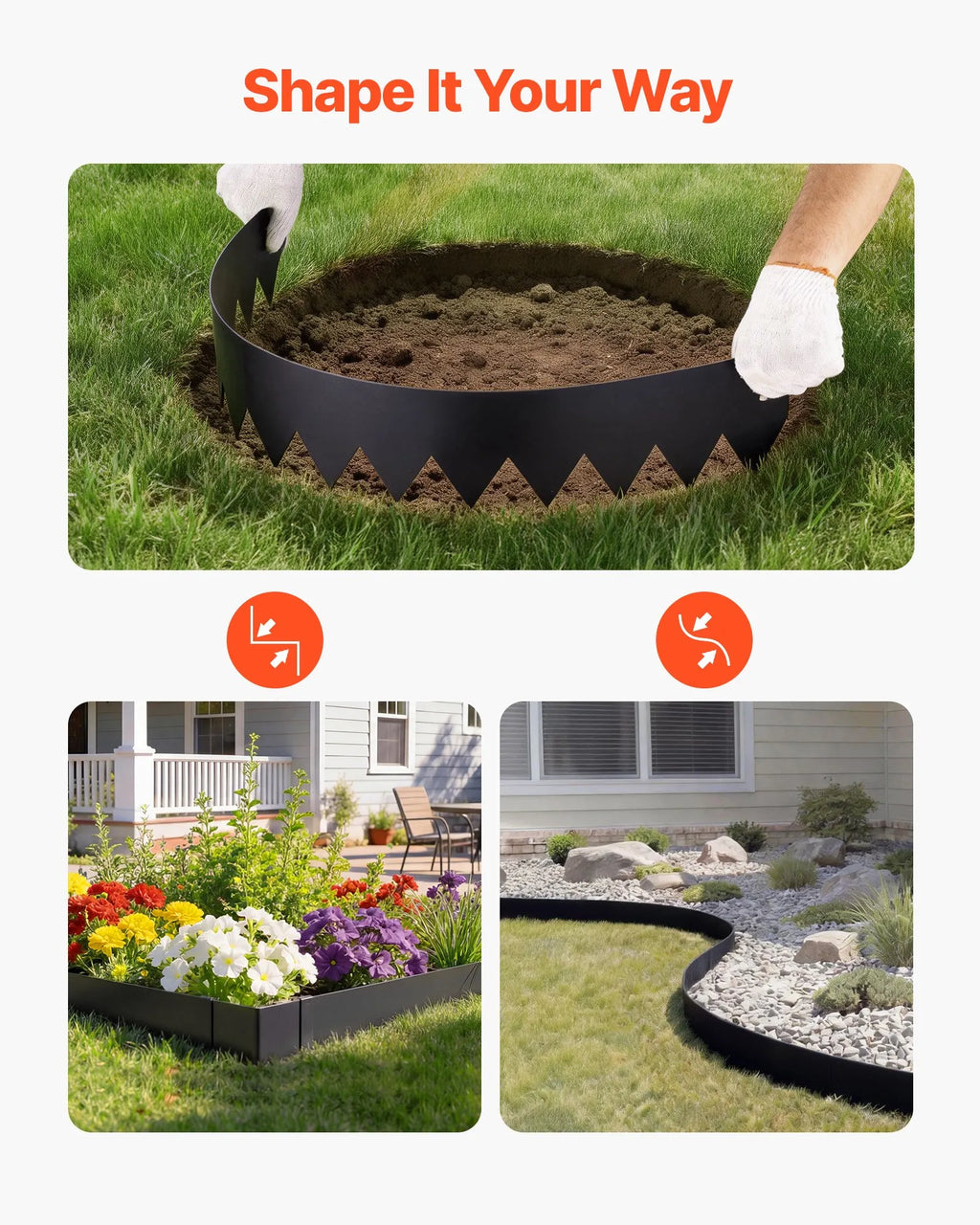 Elastīgas un viegli lokāmas: Tērauda dārza apmales var viegli veidot taisnās līnijās, asās malās vai plūstošās līknēs. Izturīgā konstrukcija saglabā formu, vienlaikus pielāgojoties dažādiem dārza dizainiem.