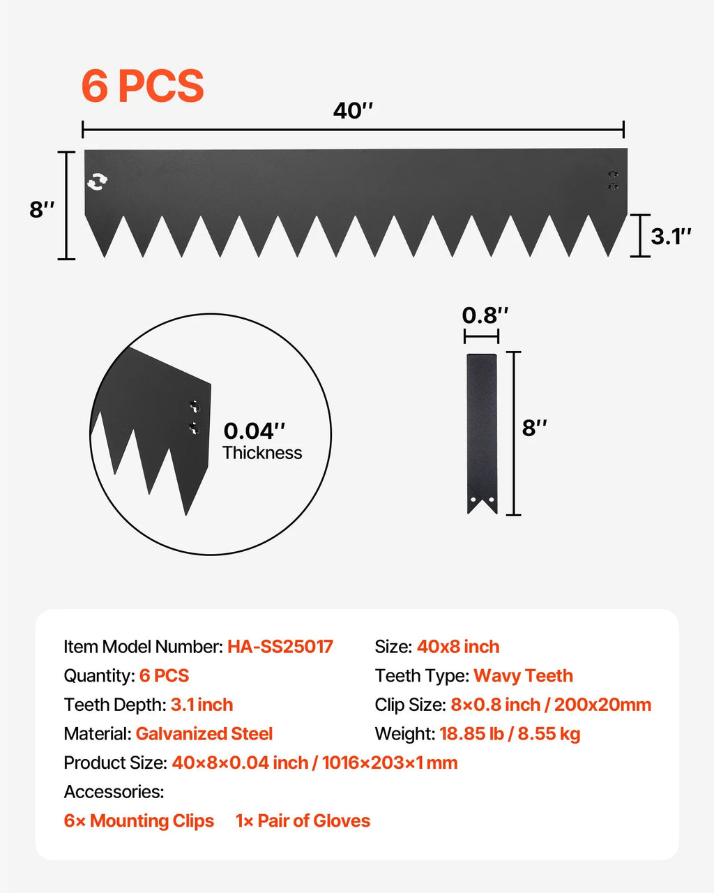 Pilns komplekts gatavs lietošanai: Komplektā ietilpst 6 apmales sekcijas, 6 stiprinājuma klipši un 1 pāris cimdu. Pagarinātie stiprinājuma tapas viegli ieslīd augsnē, padarot uzstādīšanu vienkāršu un ērtu.