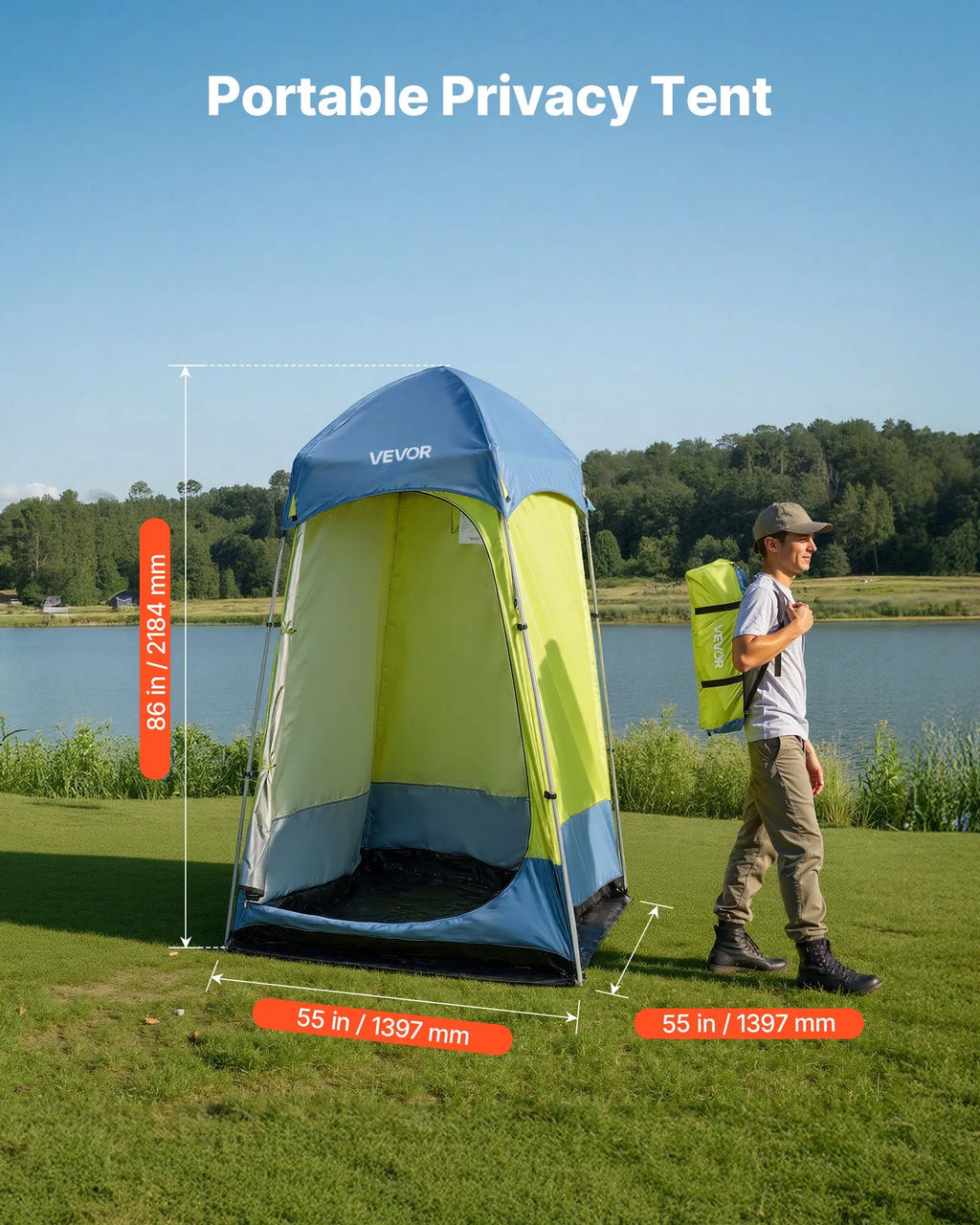 Daudzfunkcionāla telts: Privātuma telts ar izmēriem 1397 x 1397 x 2184 mm nodrošina pietiekamu vietu dušai. Tā nodrošina ventilāciju, izmantojot kā pārvietojamu tualeti, un kalpo kā privāta zona ātrai dušai, higiēnas vajadzībām vai apģērba maiņai.