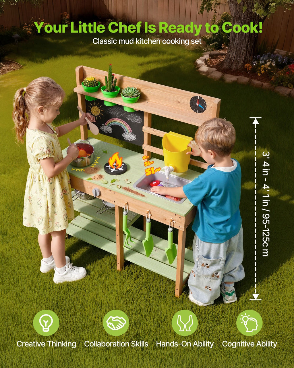 Izgatavota no kvalitatīva egles koka, šī izturīgā dubļu virtuve ir noturīga pret koroziju, plaisāšanu un deformāciju. Gludi krāsotās virsmas ir bez skabargām, nodrošinot drošu rotaļu ārā bērniem no 3 gadu vecuma.