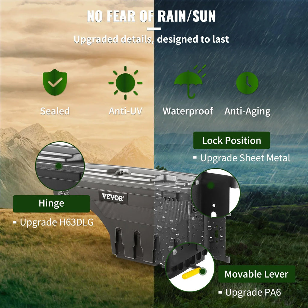 VEVOR kravas kastes instrumentu kaste nodrošina daudzpusīgu 25 l uzglabāšanas vietu. Piemērota dažādu instrumentu un aprīkojuma organizēšanai — sprūdrati, zāģēšanas piederumi, avārijas aprīkojums, starta kabeļi, kompresori u.c. Konstrukcija nodrošina ērtu piekļuvi un palīdz uzturēt kravas kasti sakārtotu.