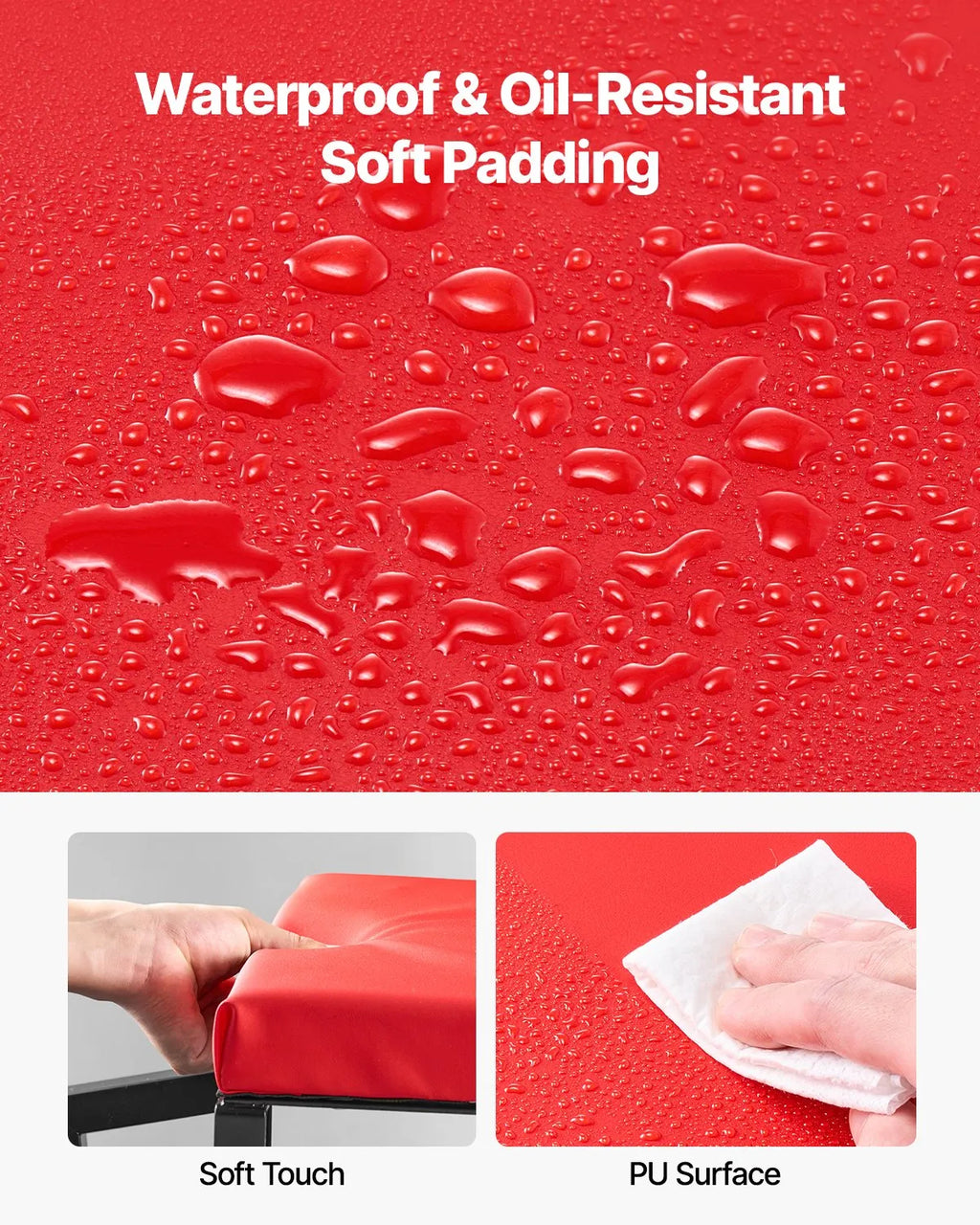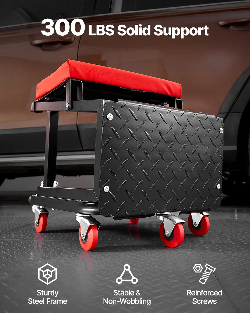 VEVOR mehāniķa rullkrēsls, 136 kg celtspēja, grozāms 360° darbnīcas sēdeklis ar riteņiem un instrumentu paliktni, piemērots garāžām, darbnīcām un auto remontam, melns