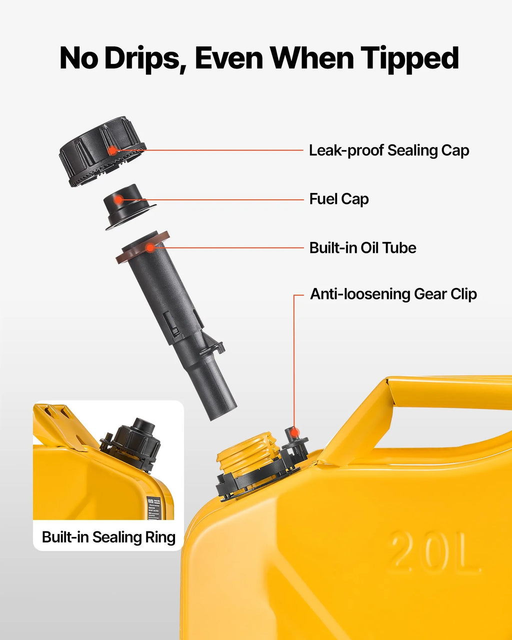 VEVOR metāla degvielas kanna ir aprīkota ar drošu noslēguma mehānismu, kas neatskrūvējas un neļauj degvielai noplūst pat braucot pa nelīdzeniem ceļiem. Hermētiskais blīvgredzens nodrošina, ka degviela paliek tvertnē, samazinot degvielas zudumus un transportēšanas riskus.