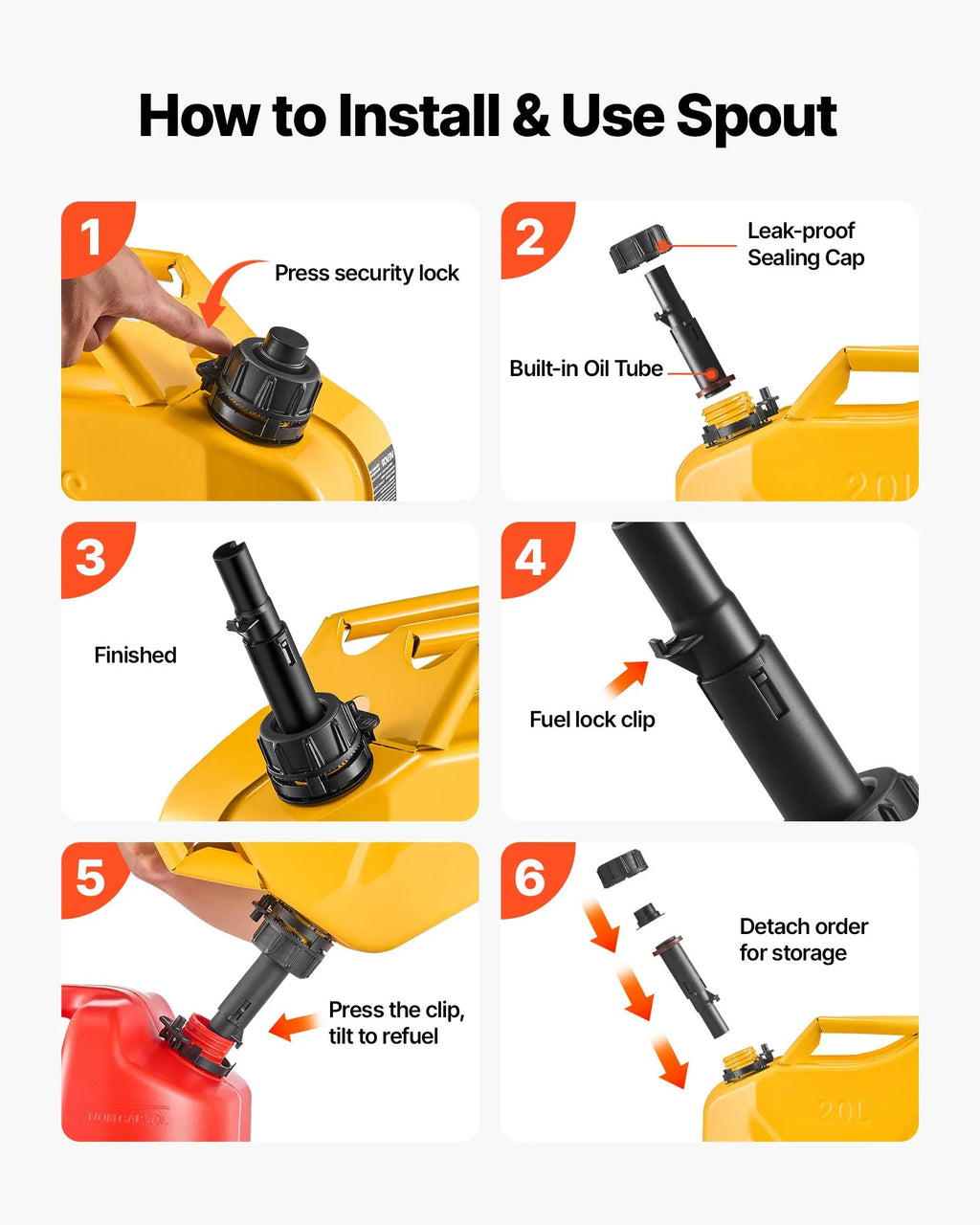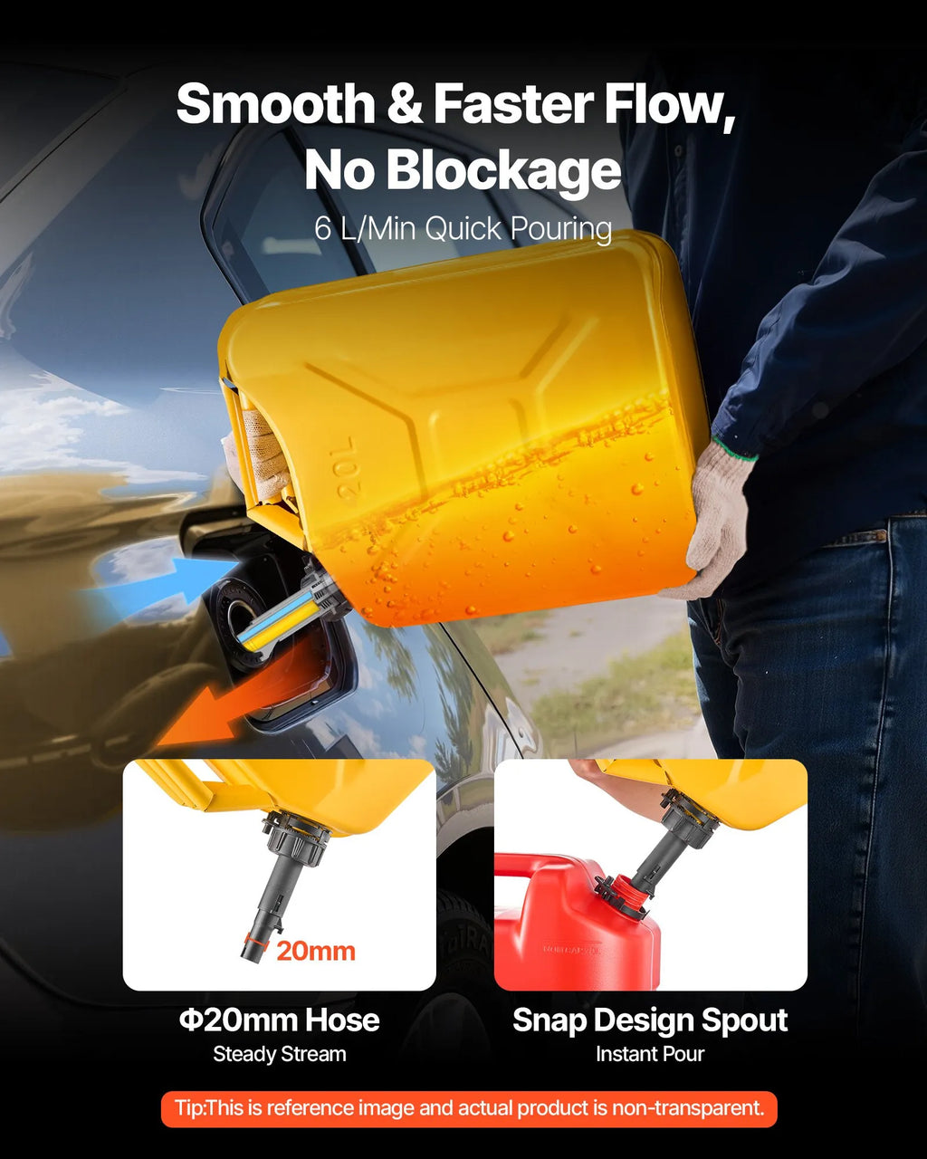 Ar VEVOR metāla degvielas kannu uzpilde kļūst ātra un efektīva. Plūsmas ātrums līdz 6 l/min nodrošina vienmērīgu degvielas plūsmu caur 20 mm uzgali, kas ļauj uzpildīt bez šļakatām.