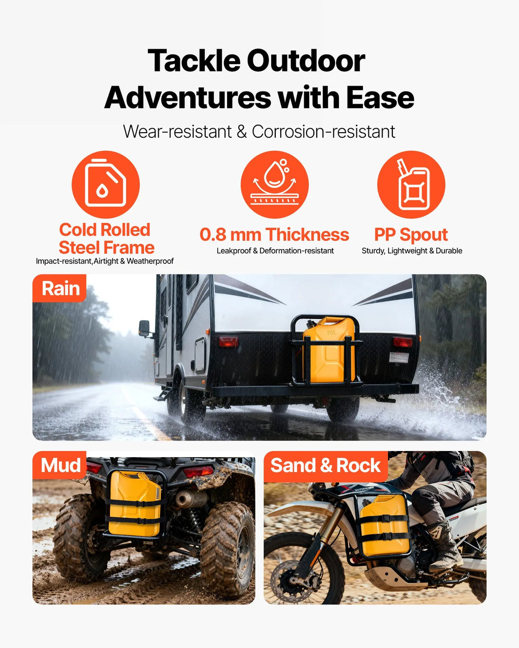Izgatavota no 0,8 mm auksti velmēta tērauda, šī VEVOR metāla kanna ir paredzēta ilgstošai lietošanai un spēj izturēt triecienus, kritienus un sarežģītus laikapstākļus. Izturīgā konstrukcija nodrošina ilgu kalpošanas laiku un aizsargā degvielu uzglabāšanas laikā.