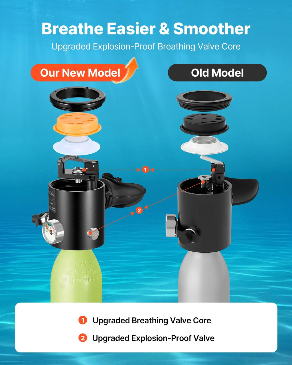 Pastiprināts balons un vārsts: Izstrādāts zemūdens lietošanai, izgatavots no aviācijas alumīnija un iztur līdz 20 MPa spiedienu. Uzlabotais elpošanas vārsts un ārējais sprādziendrošais disks nodrošina vienmērīgu gaisa plūsmu un uzticamu seklā ūdens lietošanu.