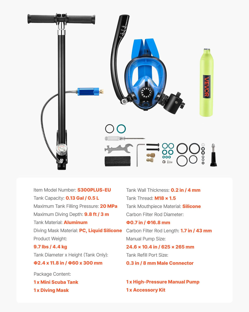 Pilns niršanas komplekts: Komplektā ietilpst 0,5 L balons, pilnsejas maska un manuālais augstspiediena sūknis. Mini niršanas balons nodrošina 5–10 minūšu elpošanas laiku zem ūdens līdz 3 m dziļumam. Piemērots snorkelēšanai un seklā ūdens izpētei.