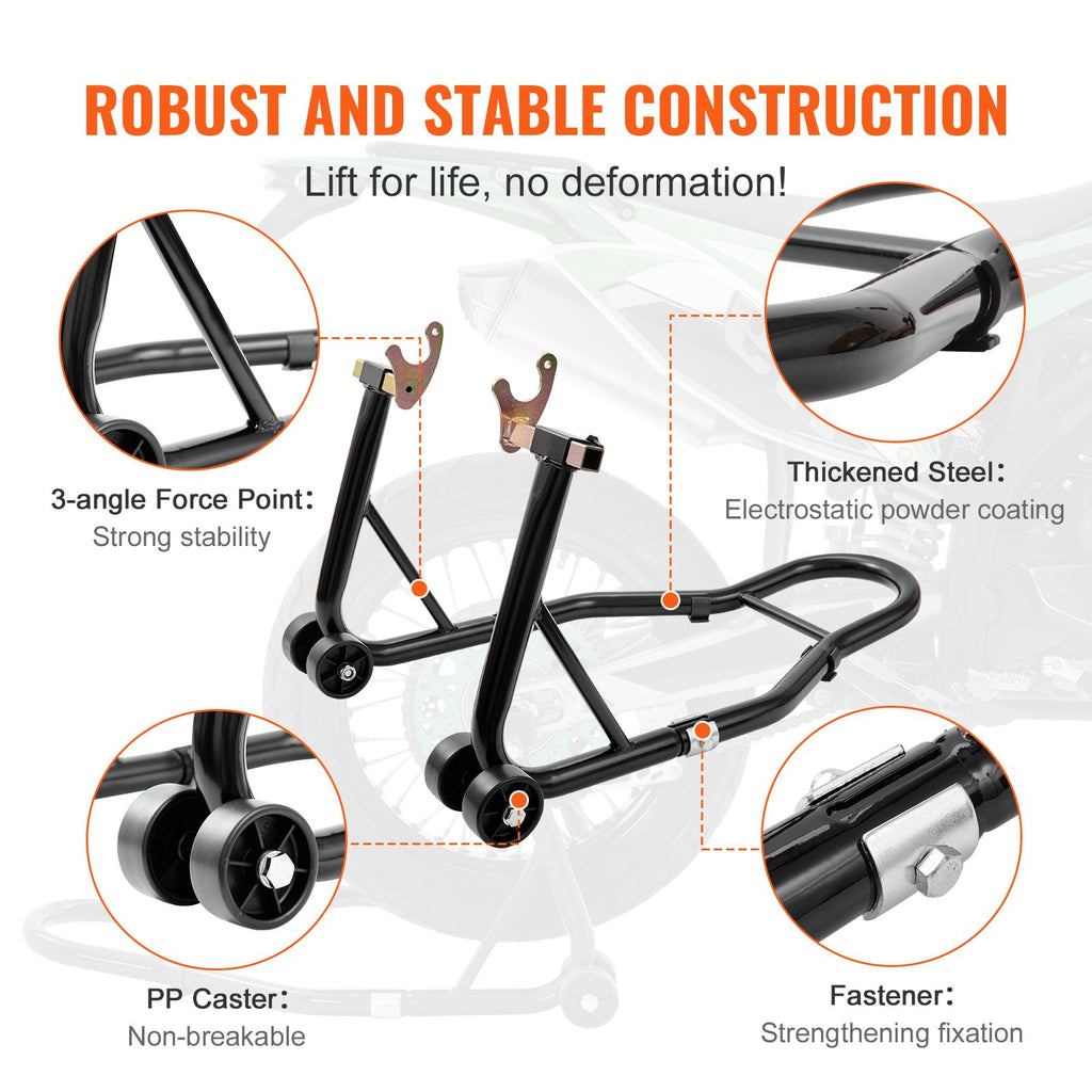 Priekšējā un aizmugurējā statīva komplekts var izturēt līdz 385 kg slodzi. Šī augstā nestspēja nodrošina stabilitāti pat smagākiem motocikliem. Izturīgā konstrukcija uztur motociklu drošā pozīcijā apkopes vai tīrīšanas laikā. Tas ir īpaši būtiski drošai lietošanai mājas apstākļos.