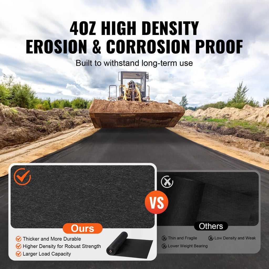 Atvadieties no noturīgām nezālēm! VEVOR 0,91 × 30,48 m, 4 OZ augsta blīvuma nezāļu barjeras ainavu audums nodrošina izcilu ūdens un gaisa caurlaidību, vienlaikus piedāvājot augstu izturību pret plīsumiem, koroziju un eroziju. Tas uzlabo augsnes veselību, efektīvi kontrolējot nezāļu augšanu un droši aizsargājot jūsu dārzu.