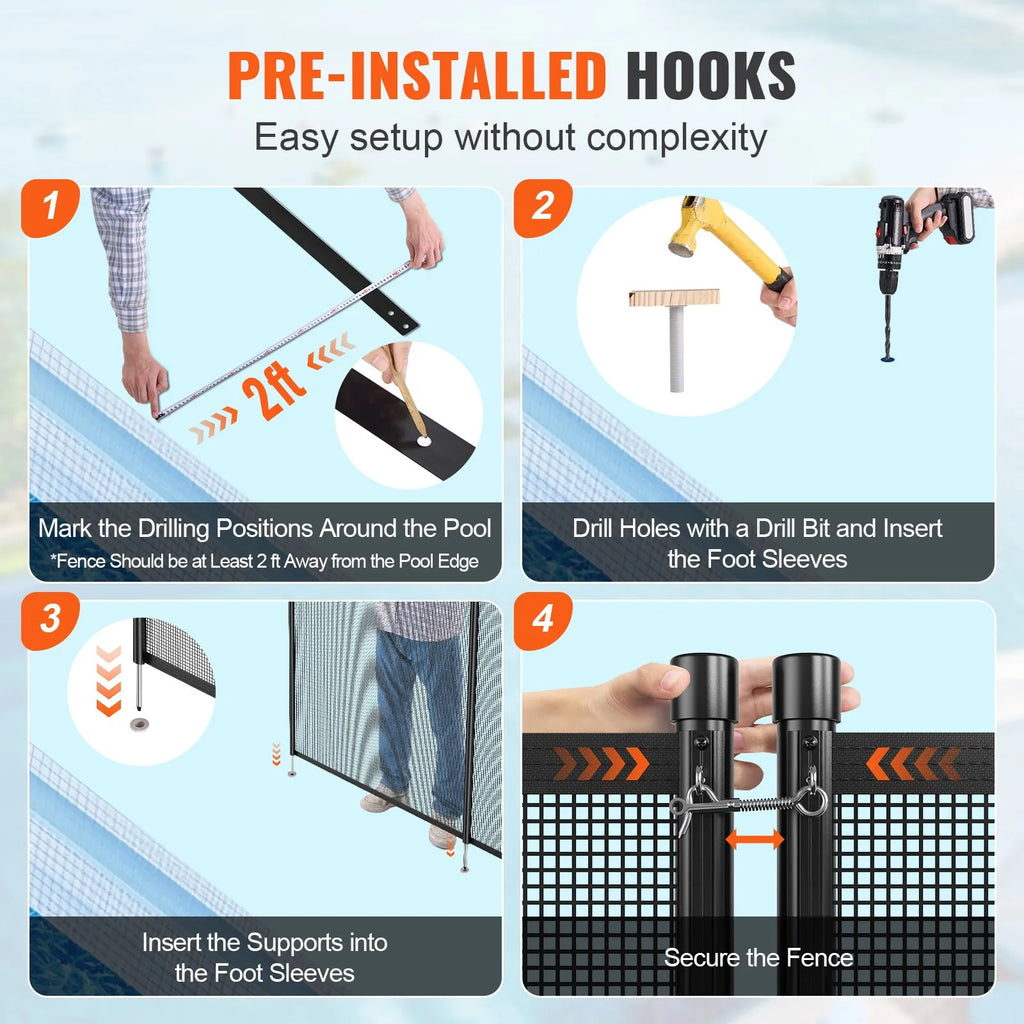 VEVOR baseina žogs nodrošina uzticamu aizsardzību baseina zonai. Tas ir piemērots dažādu formu un izmēru baseiniem, tostarp lieliem baseiniem. Šis bērnu drošības baseina žogs aizsargā bērnus un mājdzīvniekus, kalpojot kā sargs jūsu ģimenei. Žoga dizains uztur baseina zonu drošu un pasargātu. Ar sirdsmieru varat baudīt pagalmu bez raizēm. Neatkarīgi no īpašuma lieluma, žoga daudzpusība sniedz ieguvumus jūsu mājai un ģimenes labklājībai.