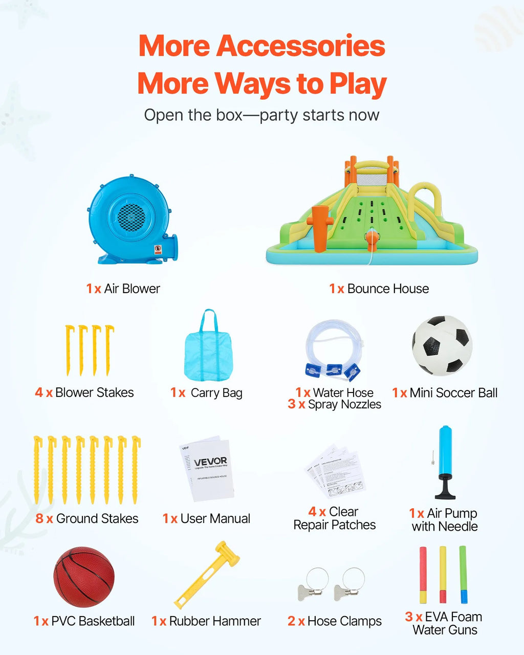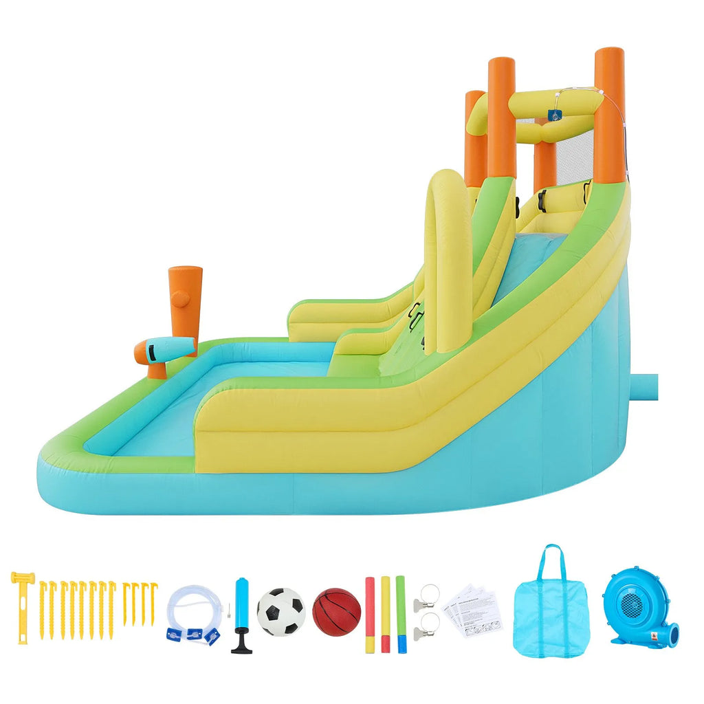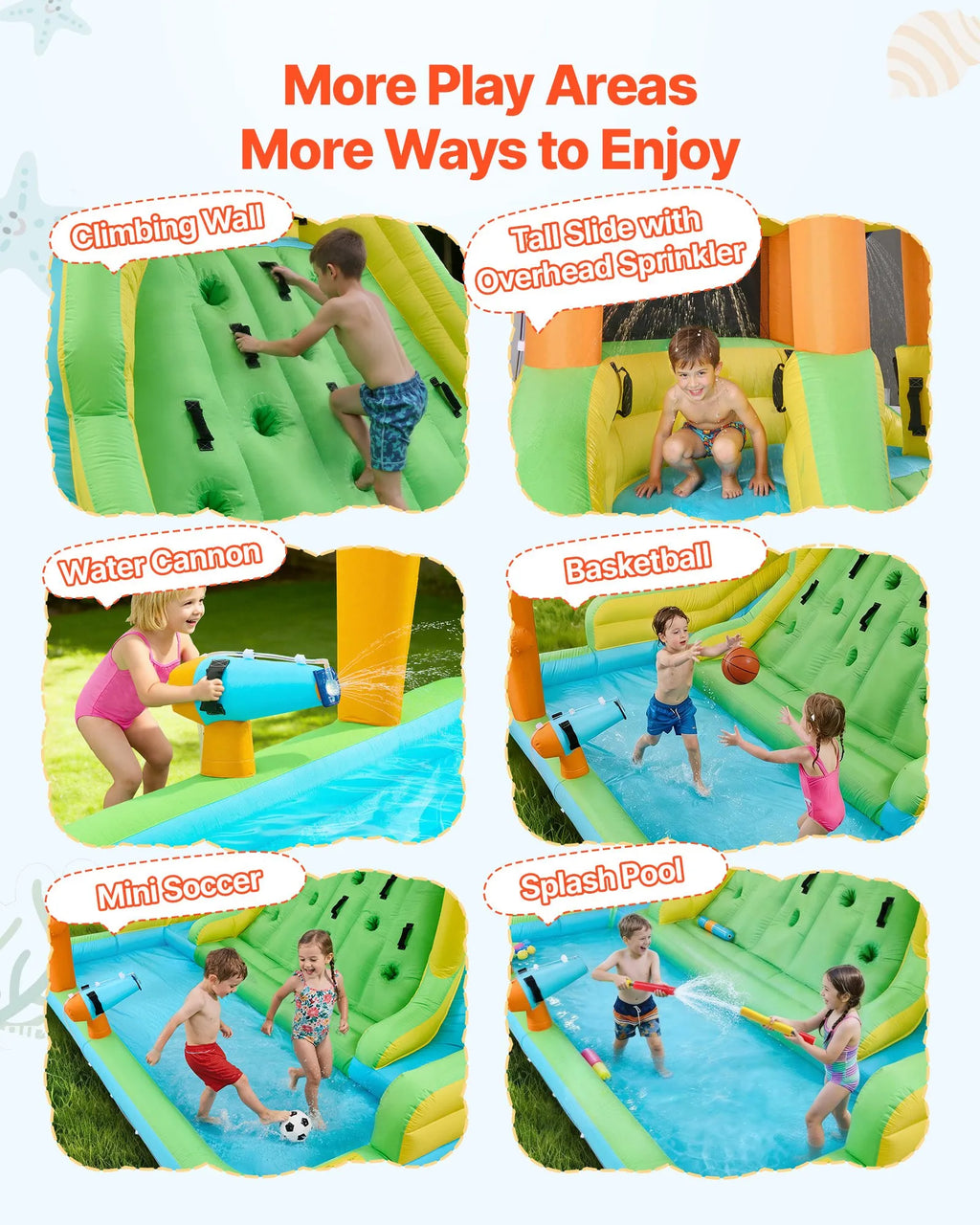 Vairāk rotaļu iespēju: Aprīkota ar lēkšanas zonu, kāpšanas sienu un diviem slidkalniņiem, šī mitrā/sausā ūdens piepūšamā atrakcija piedāvā daudzveidīgu izklaidi bērniem un ģimenei. Ūdens pistole nodrošina nepārtrauktu ūdens plūsmu, uzturot slidkalniņu un baseinu gatavu rotaļām un radot piepūšama ūdens parka pieredzi.