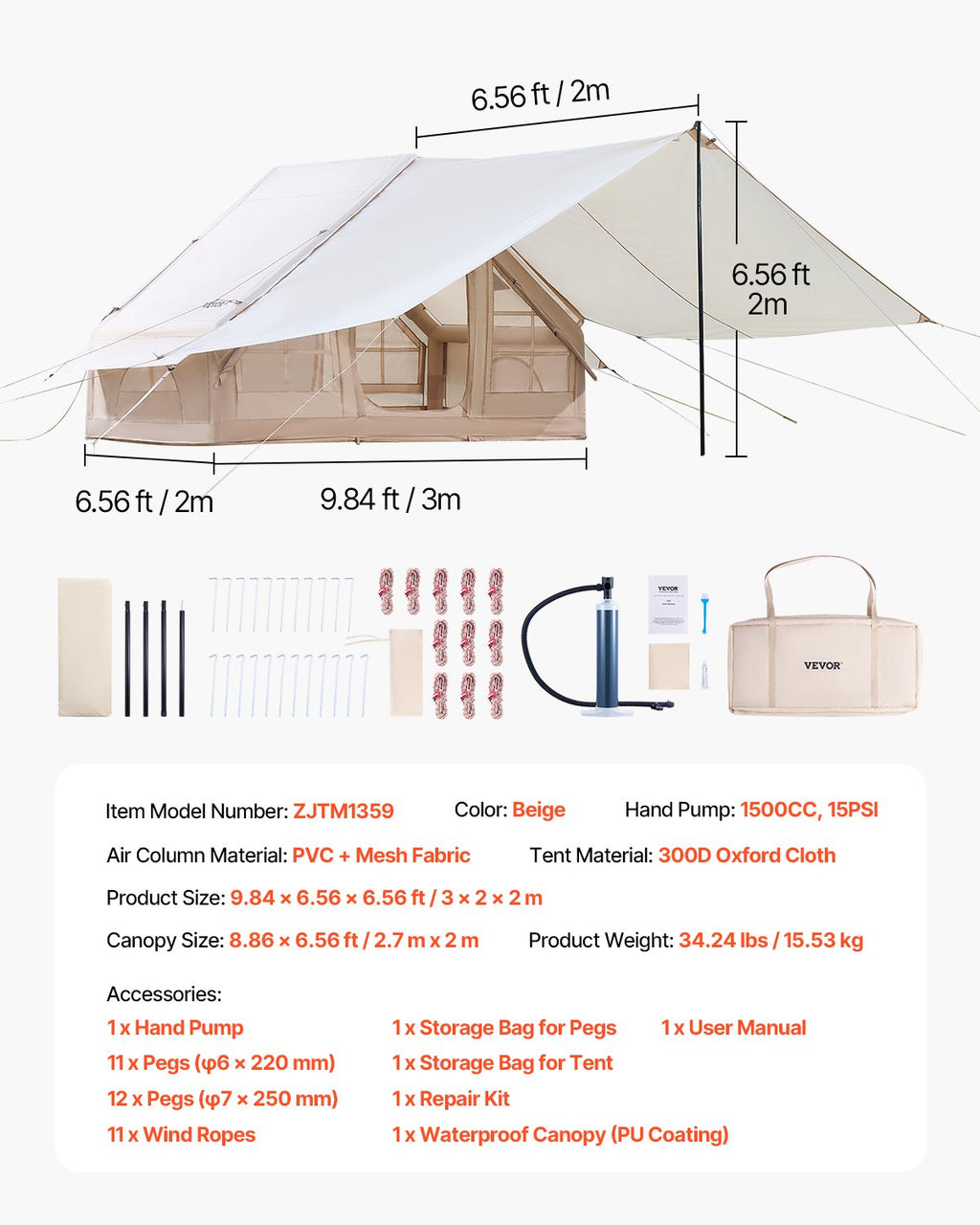 VEVOR inflatable tent for camping 3-5 persons, glamping tent with pump and awning