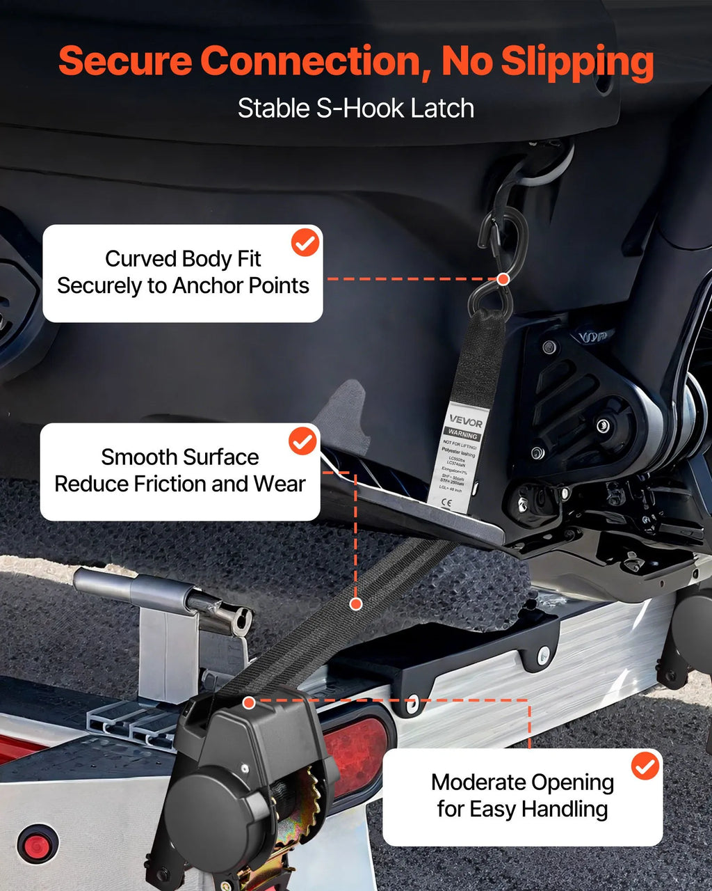 Aprīkots ar S veida āķiem, kas viegli piestiprināmi pie piekabes stiprinājuma punktiem. Nodrošina ātru riteņu nostiprināšanu un atbrīvošanu, samazinot nejaušas atvienošanās risku uz nelīdzena ceļa.
