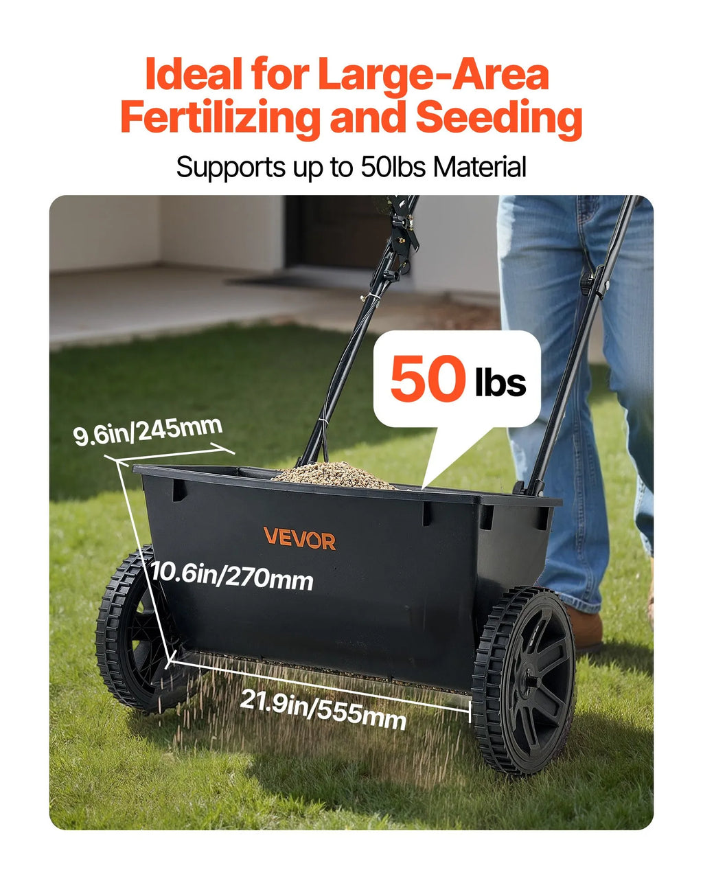 Daudzpusīga lietošana visu gadu: Dārza izkliedētājs piemērots pavasara sējai un vasaras mēslošanai, aizstājot vairākus instrumentus ar vienu ierīci. Ideāli piemērots piemājas zālieniem un mazām saimniecībām.