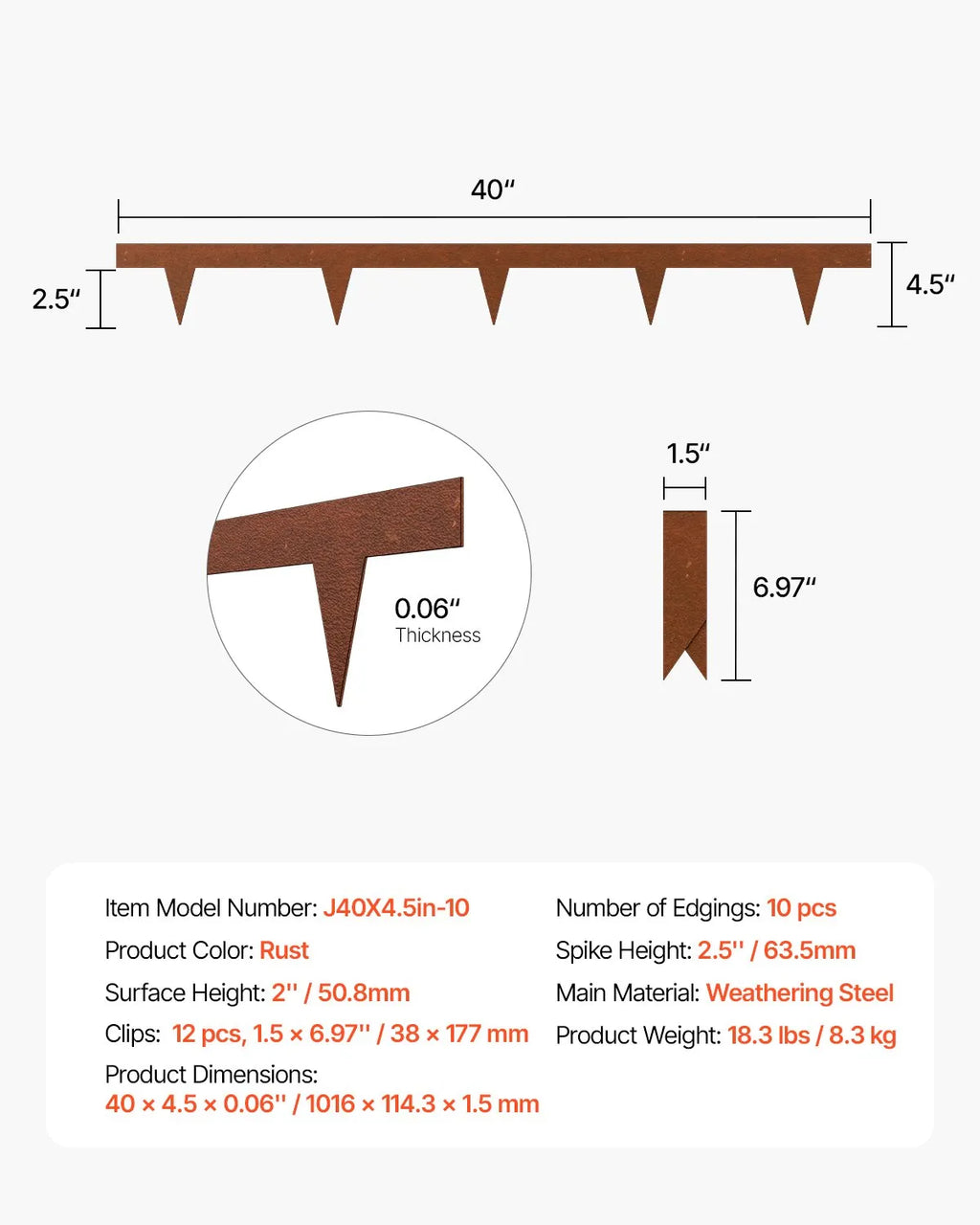 VEVOR tērauda dārza apmale, 10 gab., 1016 × 114 mm laikapstākļu izturīga iepriekš oksidēta metāla ainavas apmale, lokāma smagās klases zāliena apmale, puķu dobju, pagalma un celiņu norobežošanai