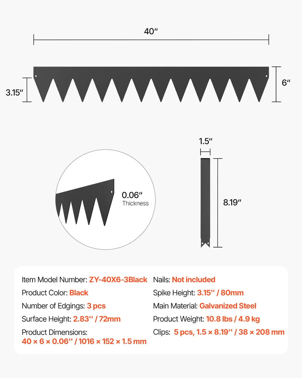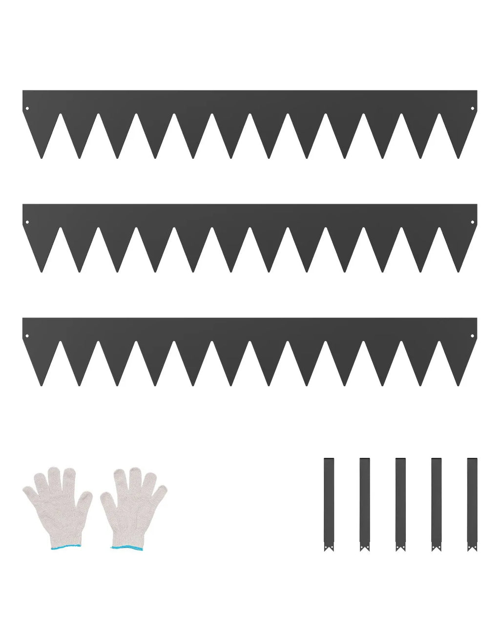 Komplektā ietilpst: Komplektā ir 3 metāla pagalma apmales, 1 pāris uzstādīšanas cimdu, 5 klipši un 1 lietošanas instrukcija. Pagarinātais smailes dizains ļauj vieglāk iedzīt elementus zemē, samazinot uzstādīšanas piepūli. Pavadiet vairāk laika, baudot savu āra telpu, un mazāk laika tās uzturēšanai.