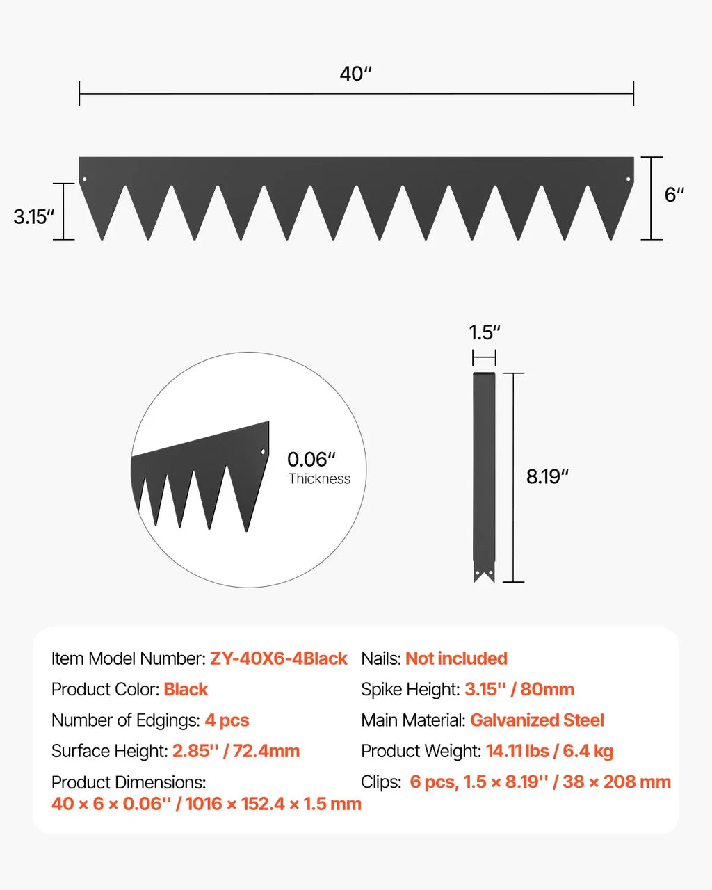 Komplektā ietilpst: Komplektā ir 4 metāla pagalma apmales, 1 pāris uzstādīšanas cimdu, 6 klipši un 1 lietošanas instrukcija. Pagarinātais smailes dizains ļauj vieglāk iedzīt elementus zemē, samazinot uzstādīšanas piepūli. Pavadiet vairāk laika, baudot savu āra telpu, un mazāk laika tās uzturēšanai.