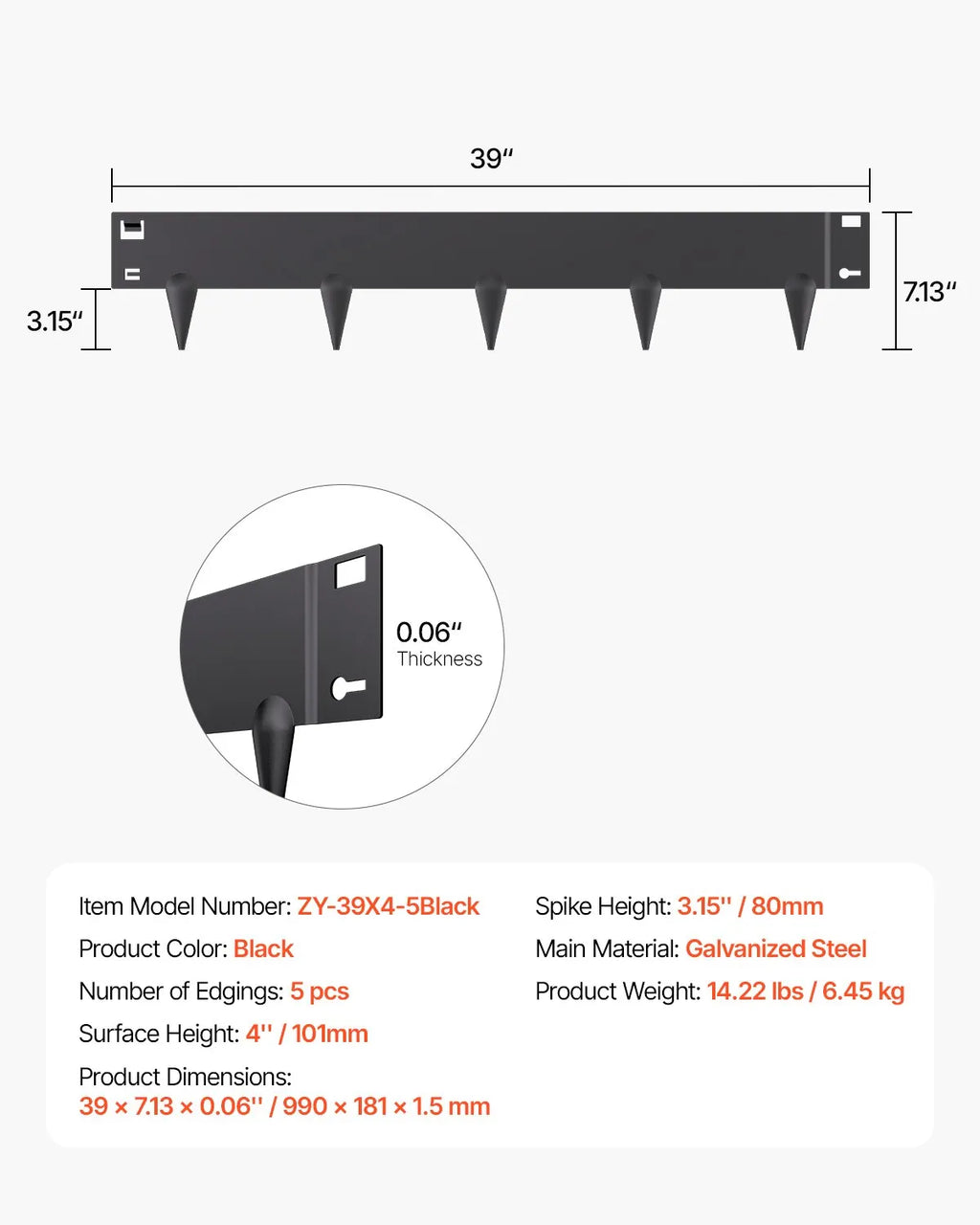 Komplektā ietilpst: Katrā komplektā ietilpst 5 metāla puķu dobju apmales, 1 pāris uzstādīšanas cimdu un 1 lietošanas instrukcija. Pagarinātā smailo stiprinājumu konstrukcija nodrošina vienkāršu uzstādīšanu, palīdzot apmalei vieglāk iespiesties zemē ar mazāku piepūli. Pavadiet vairāk laika, baudot savu dārzu, un mazāk laika tā uzturēšanai.