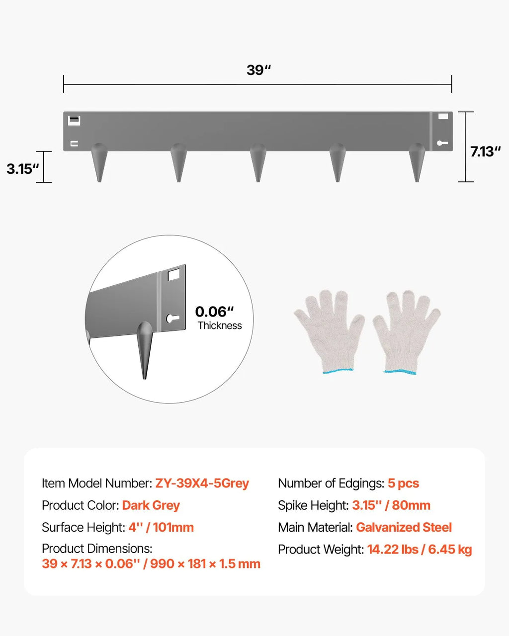 Komplektā ietilpst: Katrā komplektā ietilpst 5 metāla puķu dobju apmales, 1 pāris uzstādīšanas cimdu un 1 lietošanas instrukcija. Pagarinātā smailo stiprinājumu konstrukcija nodrošina vienkāršu uzstādīšanu, palīdzot apmalei vieglāk iespiesties zemē ar mazāku piepūli. Pavadiet vairāk laika, baudot savu dārzu, un mazāk laika tā uzturēšanai.