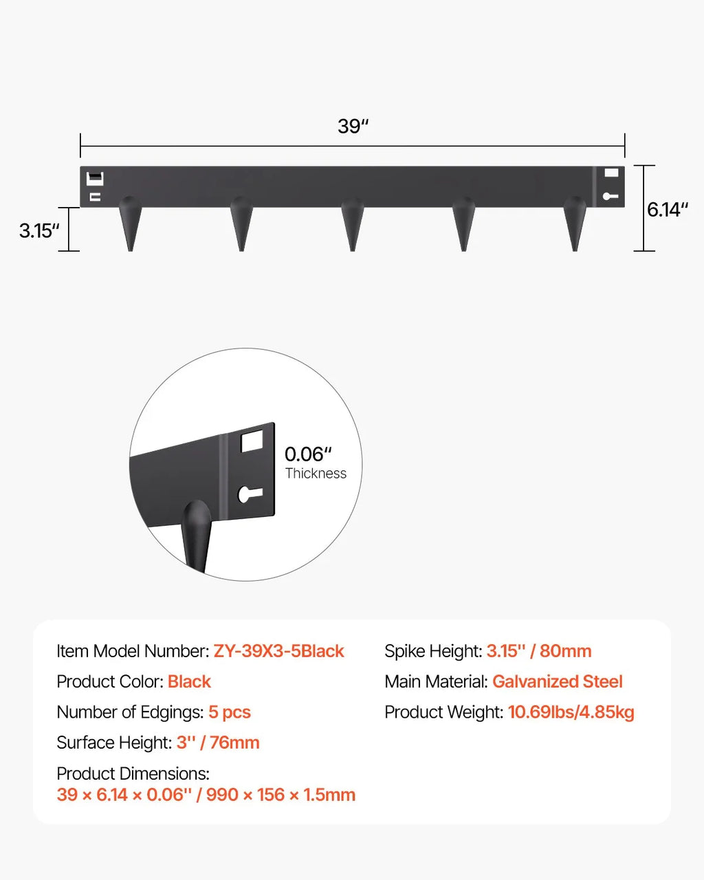 Komplektā ietilpst: Katrā komplektā ietilpst 5 metāla puķu dobes apmales, 1 pāris uzstādīšanas cimdu un 1 lietošanas instrukcija. Pagarinātā smailo stiprinājumu konstrukcija nodrošina vienkāršu uzstādīšanu, palīdzot barjerai vieglāk iespiesties zemē ar mazāku piepūli. Pavadiet vairāk laika, baudot savu dārzu, un mazāk laika tā uzturēšanai!