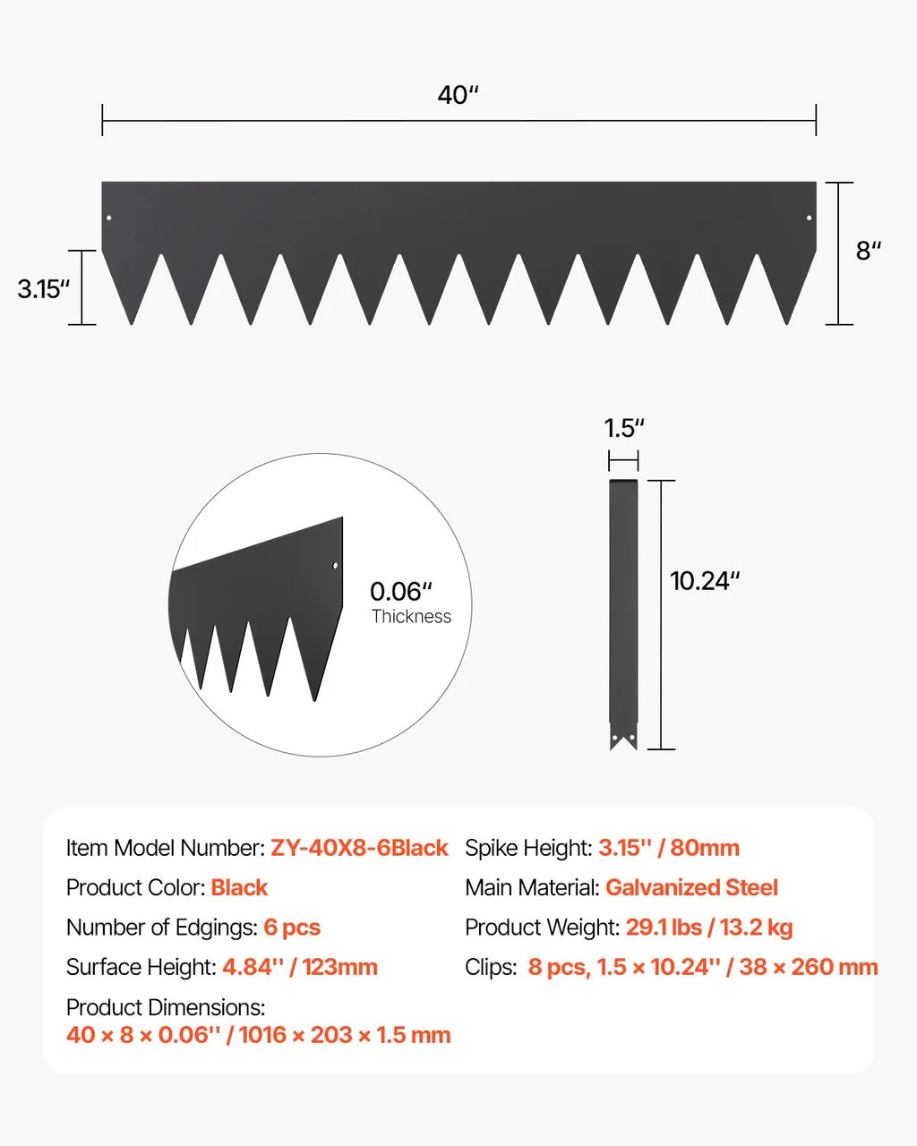 Komplektā ietilpst: Komplektā ir 6 metāla pagalma apmales, 1 pāris uzstādīšanas cimdu, 8 klipši un 1 lietošanas instrukcija. Pagarinātais smailes dizains ļauj vieglāk iedzīt elementus zemē, samazinot uzstādīšanas piepūli. Pavadiet vairāk laika, baudot savu āra telpu, un mazāk laika tās uzturēšanai.