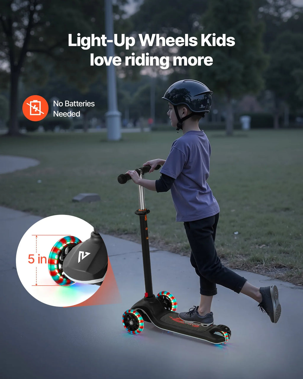 【120 mm LED riteņi】– 120 mm riteņi iedegas kustības laikā bez baterijām, nodrošinot papildu redzamību un jautrību. Lielie riteņi nodrošina vienmērīgu braukšanu pa ietvēm, asfaltu, koka un flīžu segumu, samazinot vibrāciju un troksni.