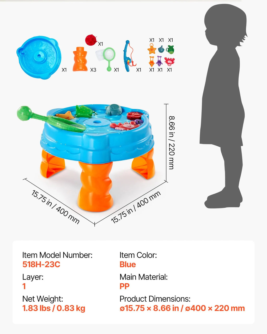 Neierobežots ūdens spēļu prieks: Paredzēts bērniem no 3 gadu vecuma, VEVOR makšķerēšanas tematikas ūdens galds nodrošina aizraujošu izklaidi ar makšķeri un tīkliņu. Komplektā ietilpst 9 rotaļu piederumi (1 ūdens rats, 1 makšķere, 1 tīkliņš un 6 makšķerēšanas rotaļlietas), piedāvājot dažādas aktivitātes, piemēram, ātrās ķeršanas sacensības un noslēpumainus makšķerēšanas piedzīvojumus.