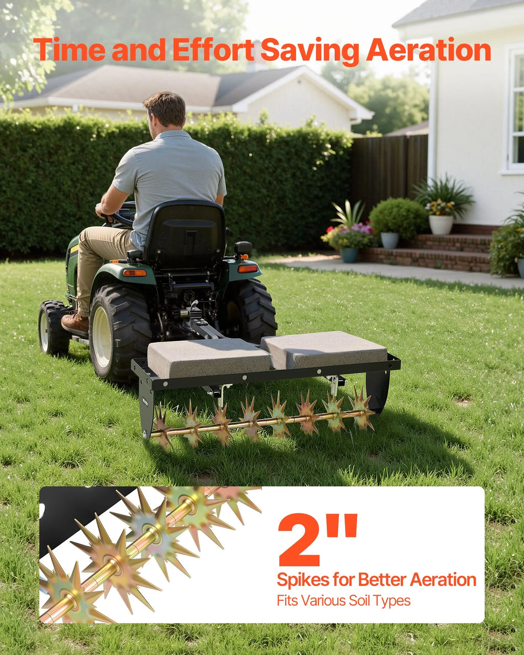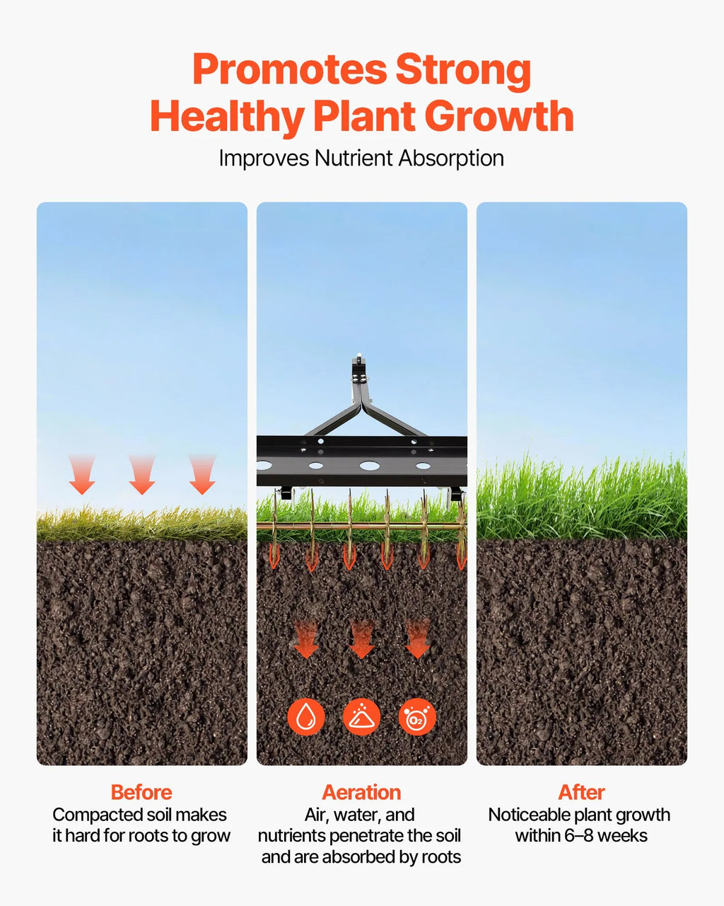 Sasniedz sakņu zonu: Aprīkots ar izturīgiem aerācijas tapām, kas iekļūst līdz 51 mm dziļumam, efektīvi uzirdinot sablīvētu augsni. Piemērots sausai, cietai, mālainai un smilšainai augsnei.