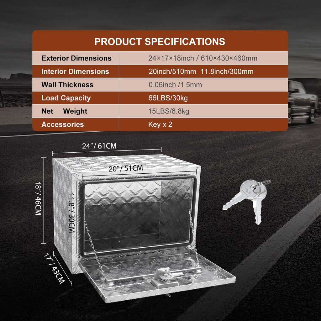 VEVOR zemās piekabes instrumentu kaste paplašina jūsu kravas automašīnas, piekabes vai cita lielā transportlīdzekļa uzglabāšanas telpu. Jūs varat uzglabāt visu nepieciešamo, sākot no apkopšanas rīkiem līdz kempinga aprīkojumam, šajā kravas kastē, un saglabāt visu organizētu.
