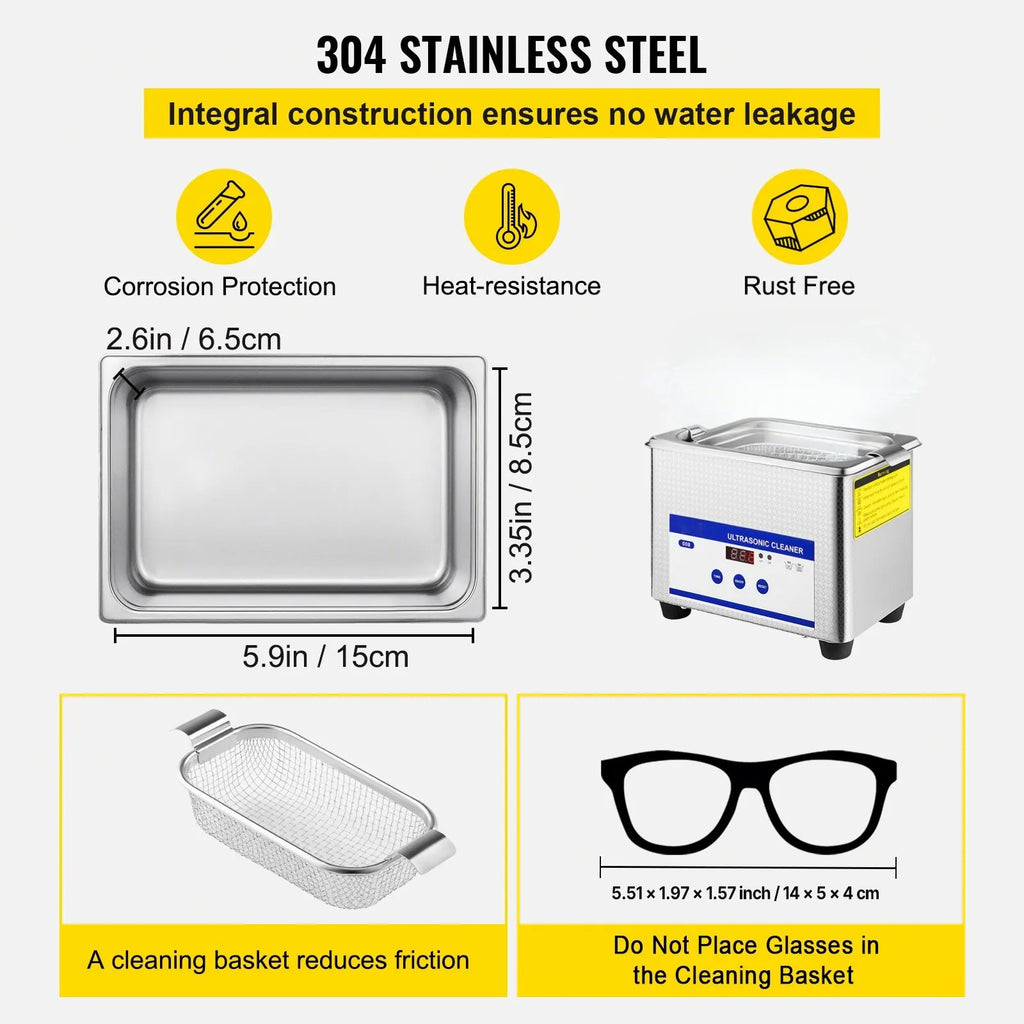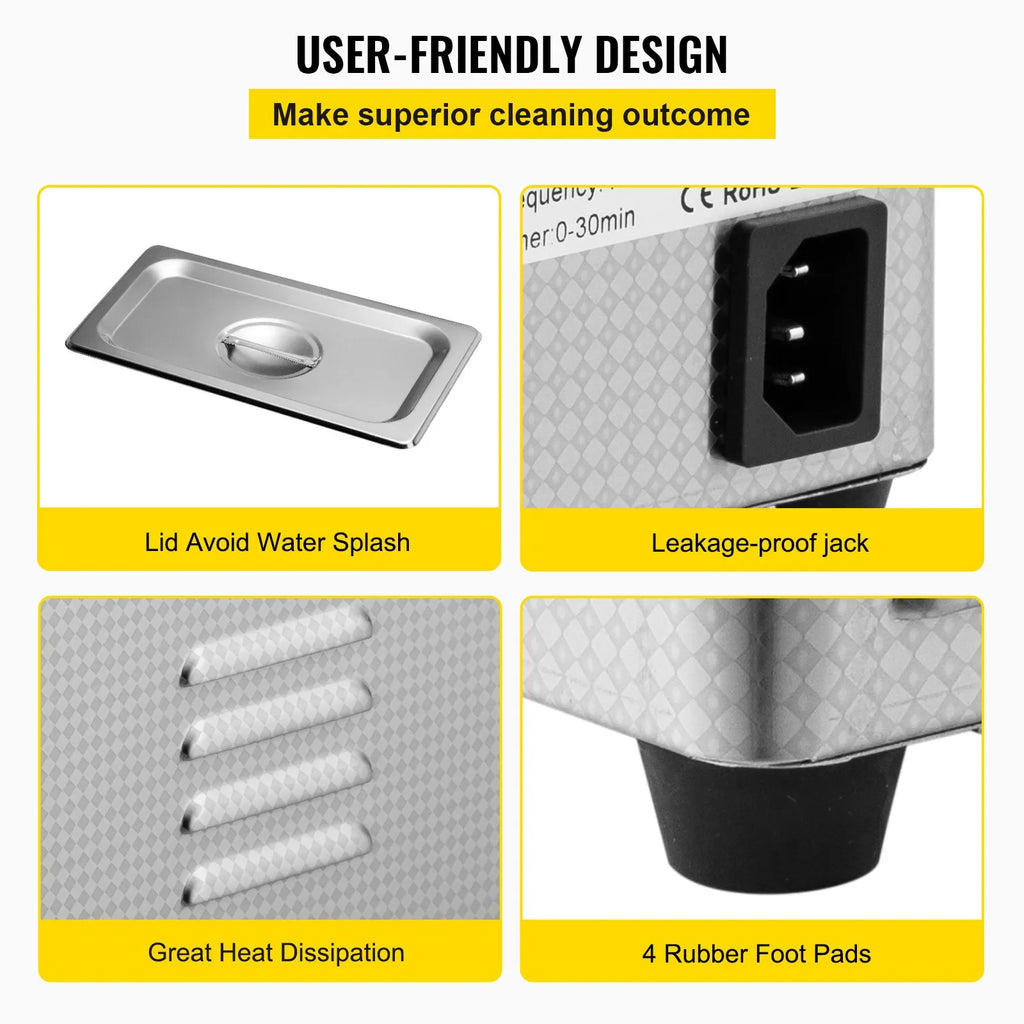 VEVOR Digital Ultrasonic Cleaner aitab teil hõlpsasti eemaldada kangekaelse mustuse ilma esemeid kahjustamata. Ultraheli lained tungivad väikestesse pragudesse ja eemaldavad kiiresti rasva ja mustuse, jättes ehted, tööriistad ja muud osad nagu uued. Säästab aega ja vaeva särava läike ja puhtuse saavutamiseks. Vaikne mootor muudab puhastamise muretuteks - mugavaks ja tõhusaks.