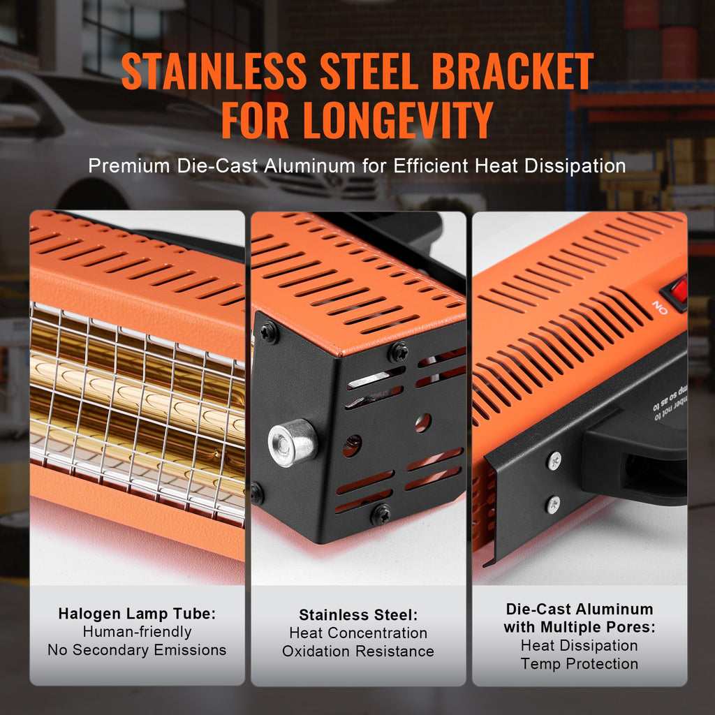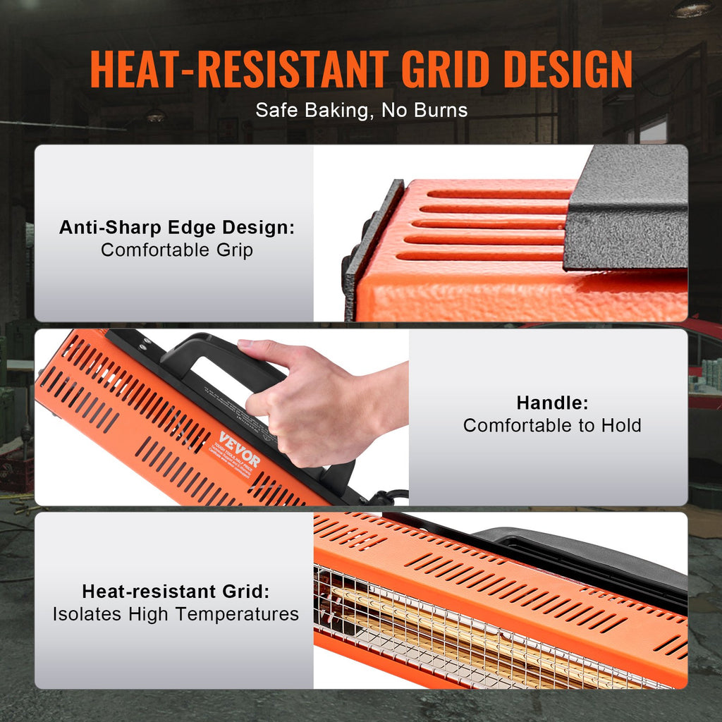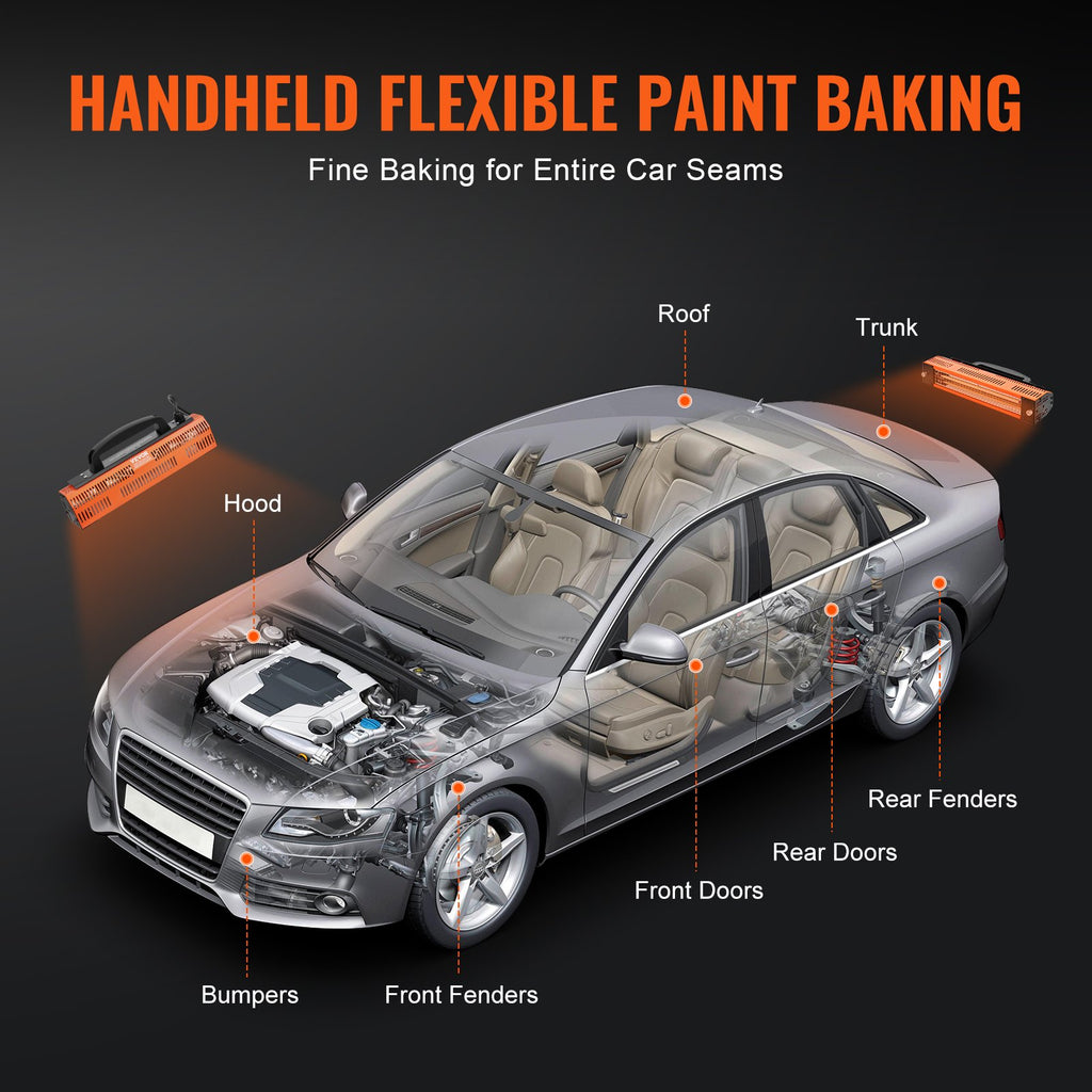 VEVOR 1000W käeshoitav infrapunavärvikuivatuslamp on suure jõudlusega seade, mis on mõeldud autokere värvide, kruntvärvide ja muude pinnakatete kiireks ja tõhusaks kuivatamiseks.