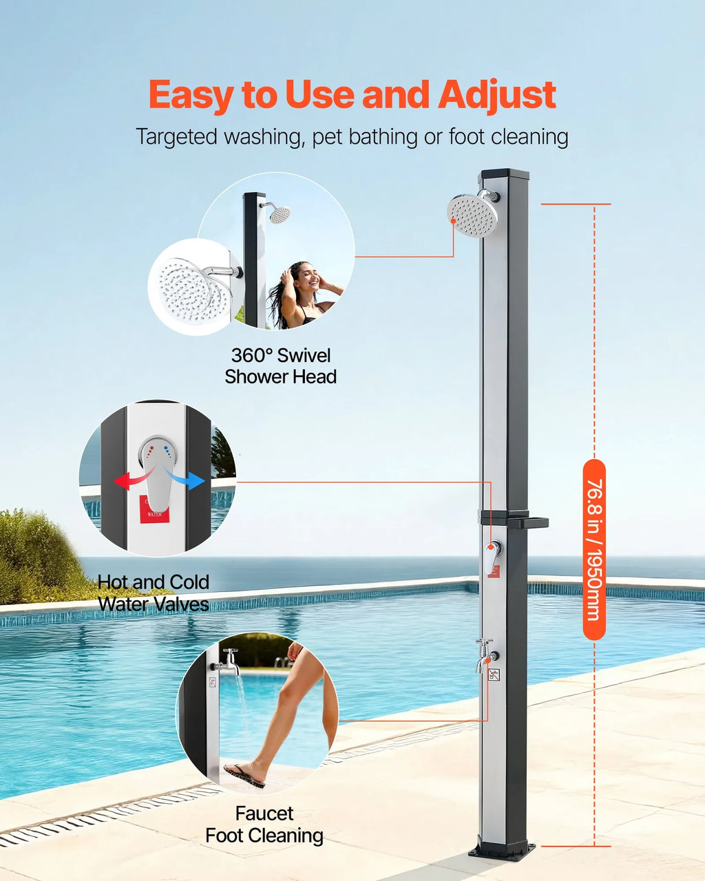 Baudiet āra dušas: Ideāli piemērota noskalošanai pirms vai pēc peldēšanās vai atvēsināšanai karstās dienās. Piemērota lietošanai dārzā, pludmalē, pie baseina vai uz terases. Komplektā 420D Oxford pārsegs aizsardzībai pret laikapstākļiem, piemērota arī uzglabāšanai telpās aukstākos mēnešos