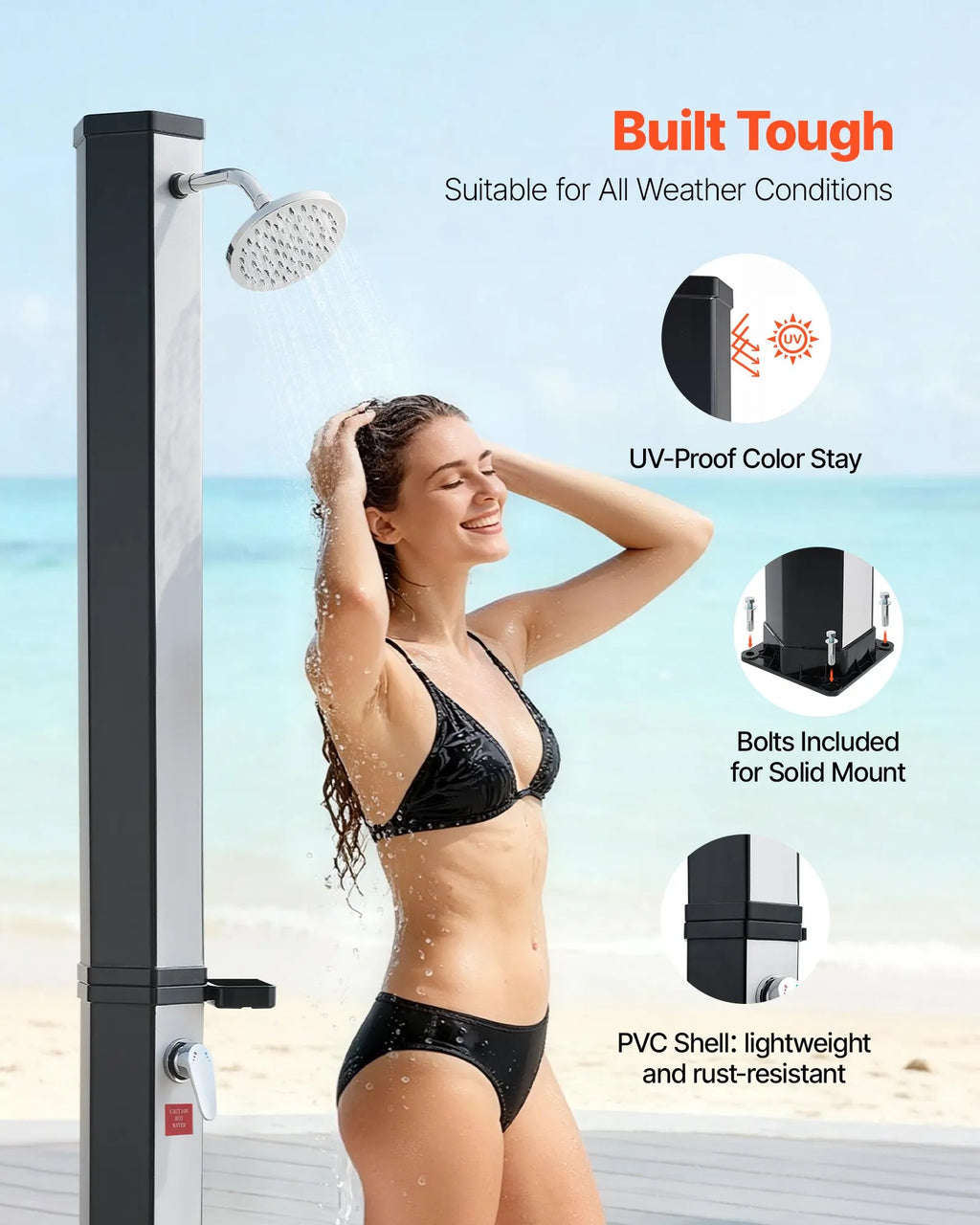 35 l ar sauli apsildāma duša: Paredzēta āra dušām ar saules siltuma izmantošanu. 35 l ietilpība nodrošina regulējamu karstā un aukstā ūdens padevi optimālai āra dušas pieredzei. Piezīme: piemērota tikai vasarai vai siltam rudenim, nav paredzēta lietošanai ziemā