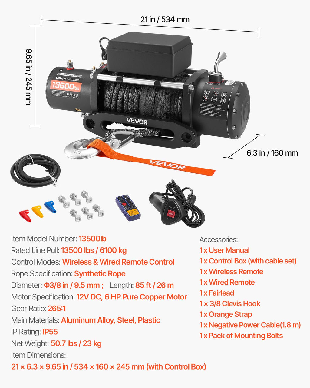 VEVOR elektriskā vinča 12 V, vilkšanas jauda 6100 kg, sintētiskā trose Ø9,5 mm × 26 m, bezvadu un vadu tālvadība, IP55 aizsardzība apvidus auto, džipiem, piekabēm un laivām
