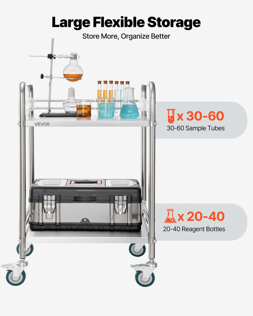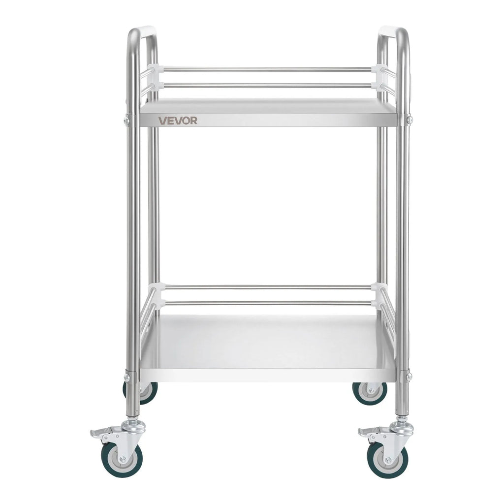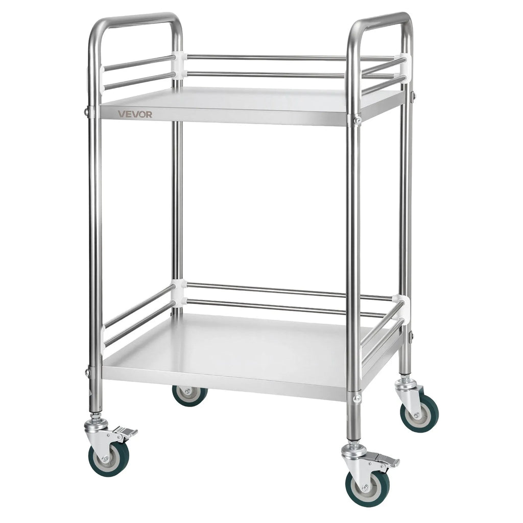 VEVOR nerūsējošā tērauda ratiņi, 2 līmeņu pārvietojami laboratorijas un servisa ratiņi ar bloķējamiem riteņiem, medicīnas apkalpošanas ratiņi ar paplātēm, pastiprināti mobilie uzglabāšanas ratiņi slimnīcām, restorāniem, virtuvēm un saloniem