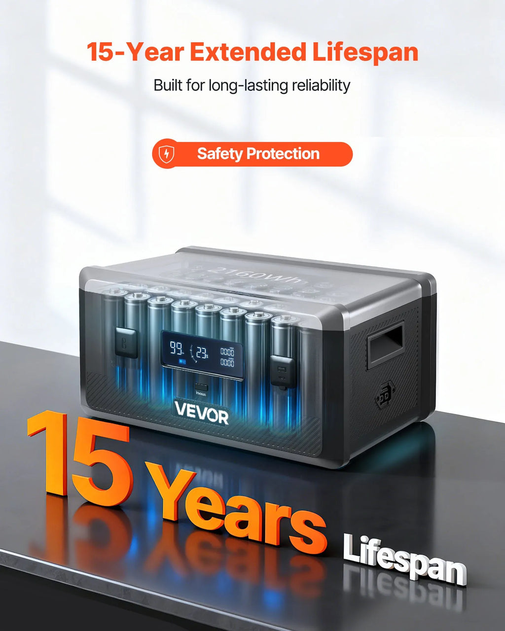 VEVOR papildu akumulators portatīvajai elektrostacijai, 2160 Wh LiFePO4 paplašināšanas akumulators ar 3 izejas pieslēgvietām lietošanai mājās, kempingā, ceļojumos un ārkārtas situācijās