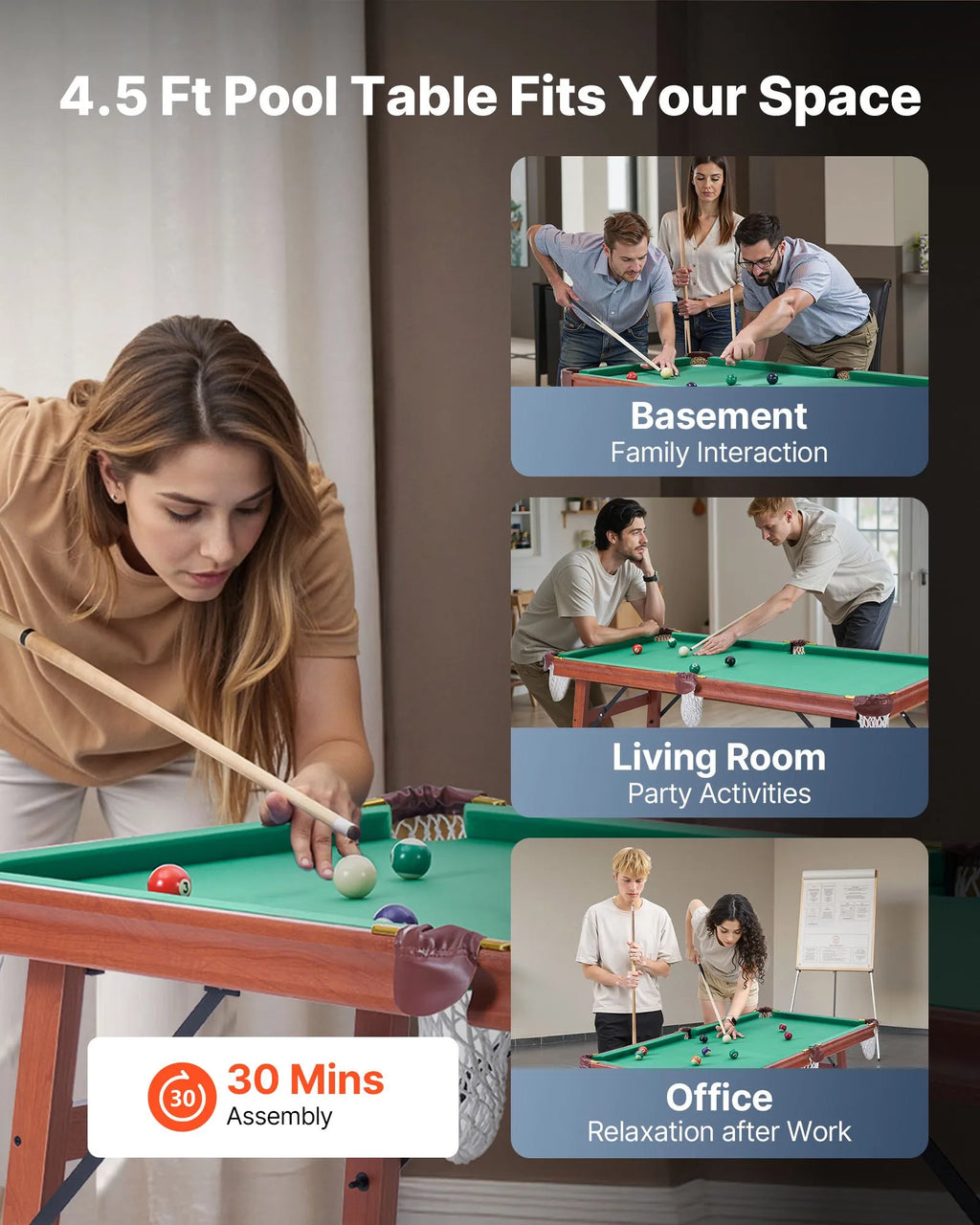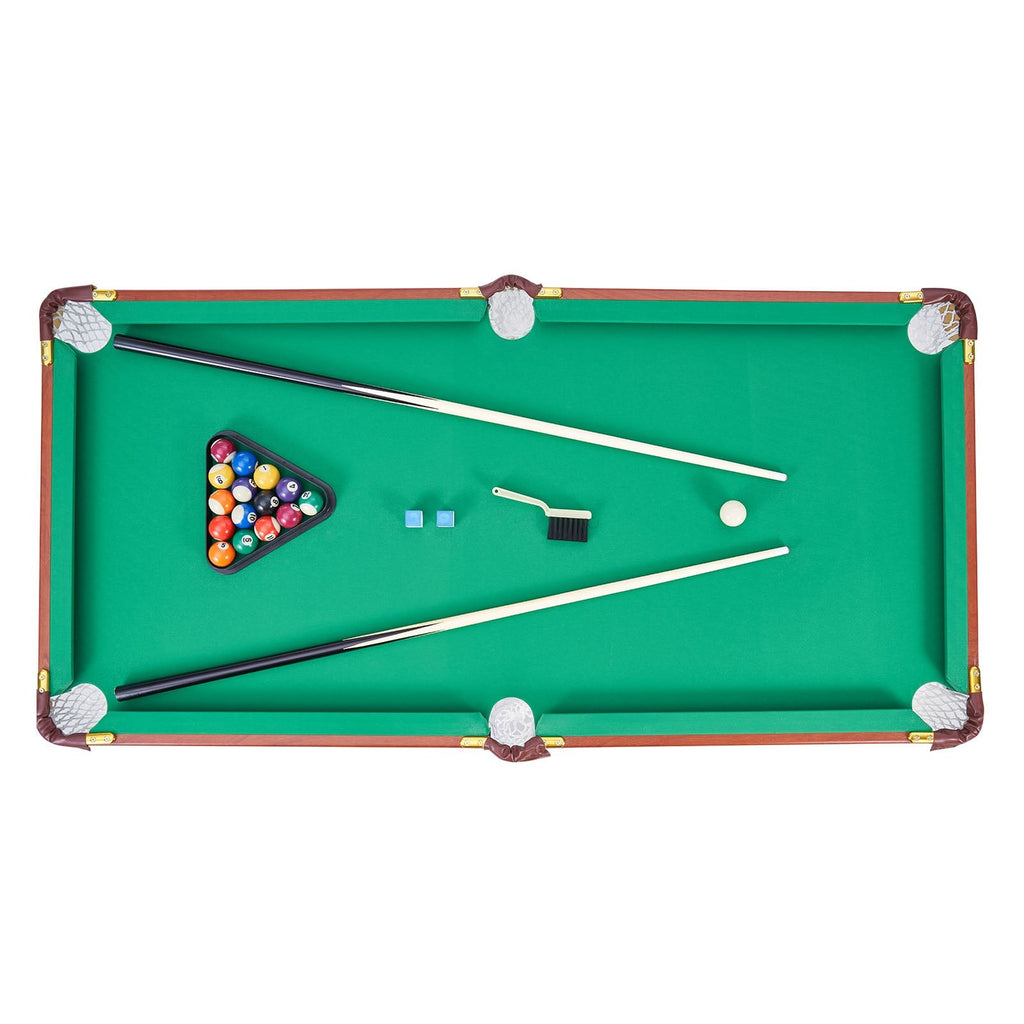 Pilns komplekts: Kijas, bumbas, krīts, birste un trijstūris – viss iekļauts komplektā. Nav trūkstošu detaļu. Atveriet biljarda galdu, atlokiet kājas un sāciet spēli dažu minūšu laikā.