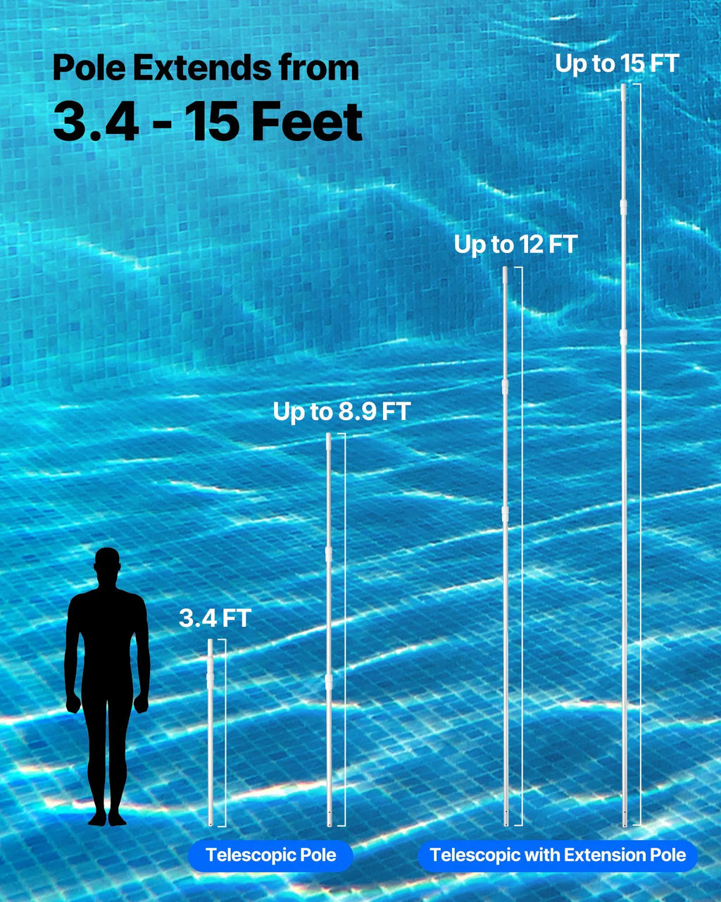 Regulējams garums: Teleskopiskais baseina kāts pagarināms no 1 līdz 4,6 m, piemērots gan seklu, gan dziļu vietu tīrīšanai. Viens kāts dažādiem pielietojumiem.