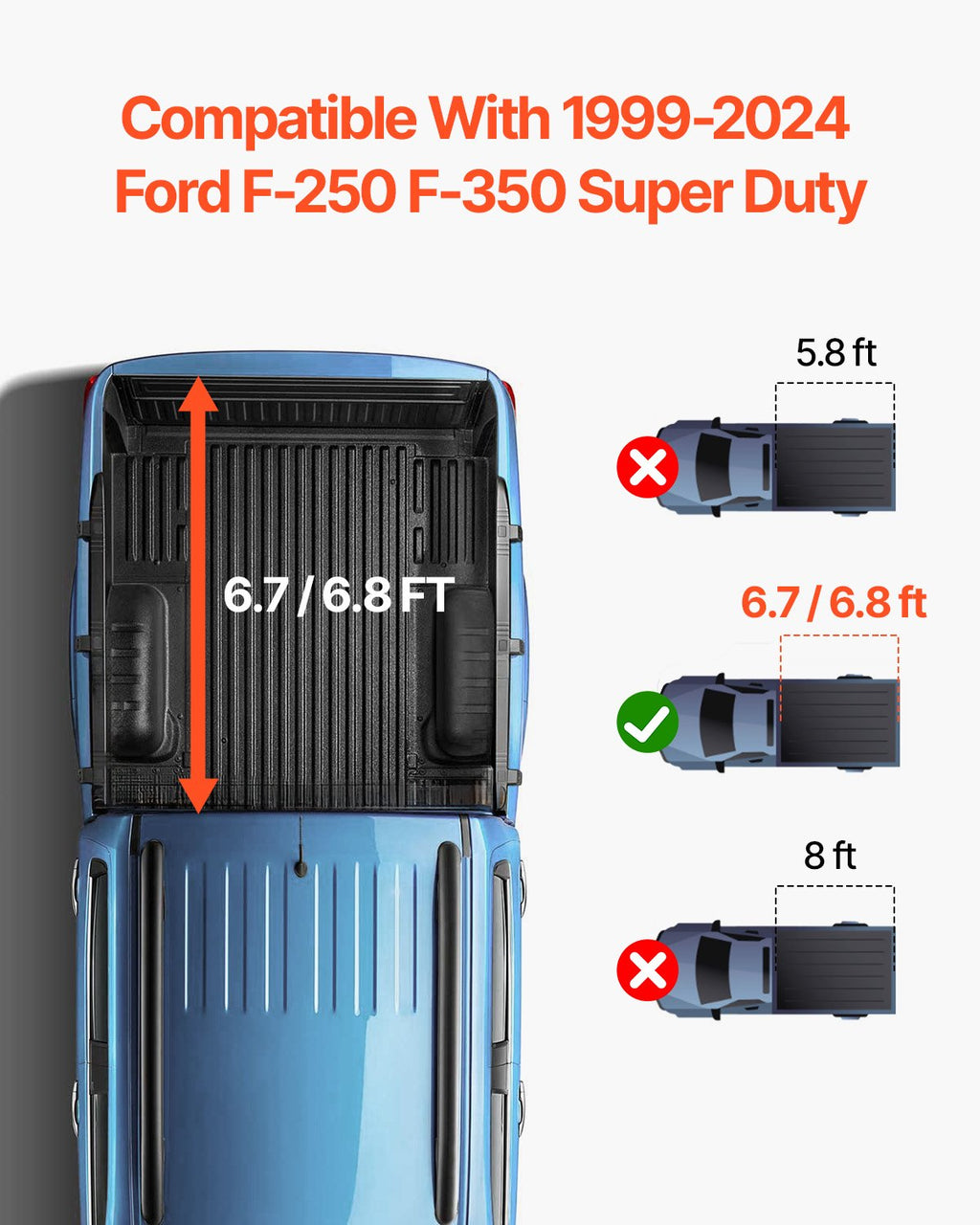 VEVORi kolmeosaline kaubakasti kate on spetsiaalselt mõeldud Ford F-250 ja F-350 Super Duty mudelitele (1999-2024). See disain tagab täiusliku sobivuse 6,75-jalgsele Styleside-lastikastile. Kate sobib ideaalselt kaubakastile mõõtmetega 2052 x 1646 mm või 2037 x 1646 mm.