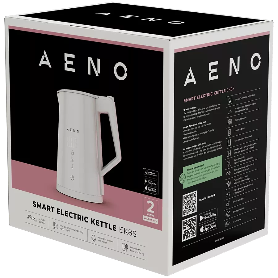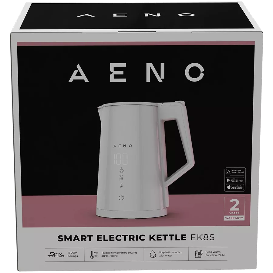 AENO elektriskā tējkanna EK8S Smart: 1850–2200 W, 1,7 L, Strix, dubultsienu korpuss, temperatūras kontrole, uzturēšanas funkcija, vadība caur Wi-Fi, LED displejs, nesakarstošs korpuss, automātiska izslēgšanās, aizsardzība pret darbību bez ūdens