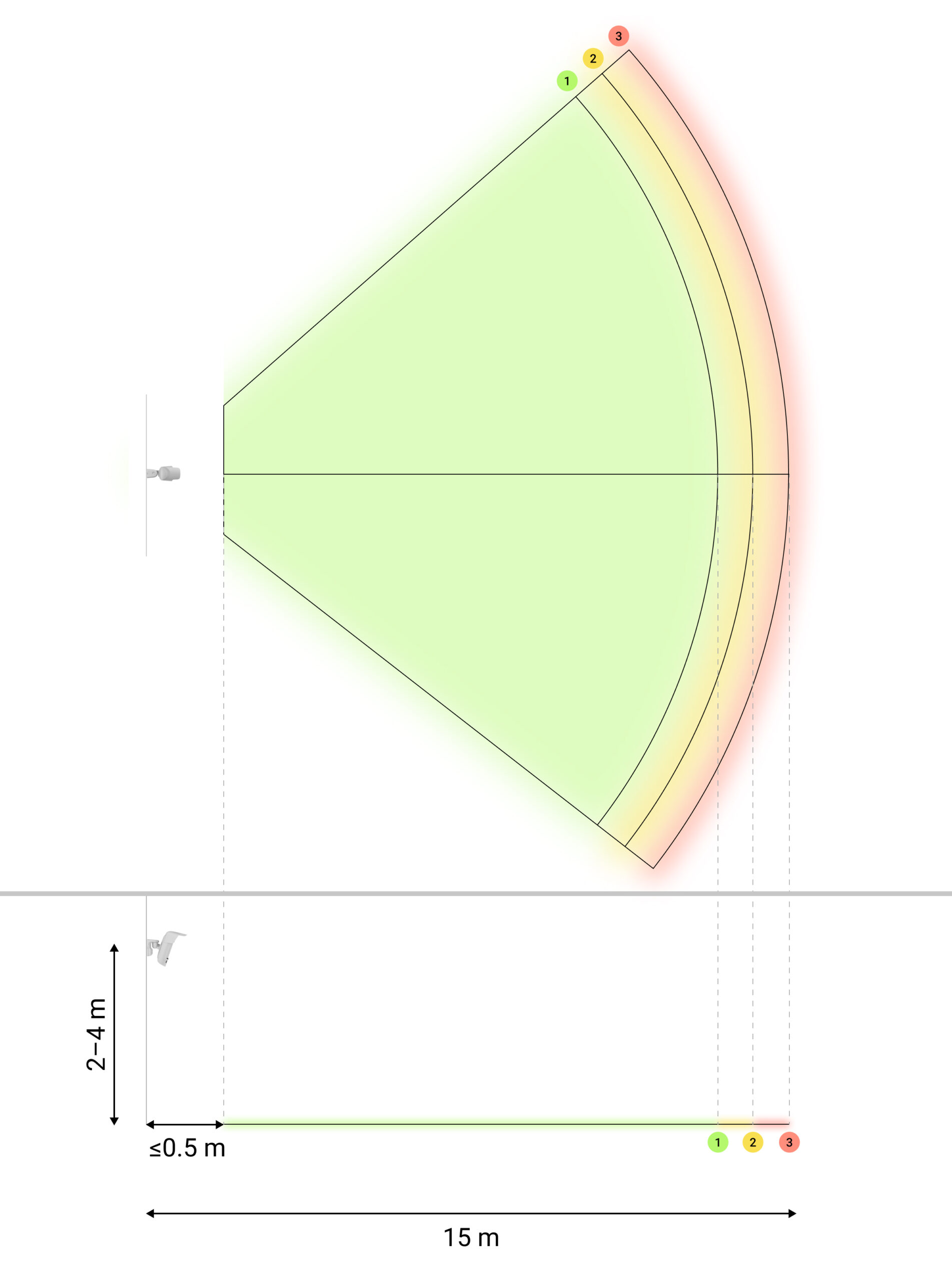the ground distance from the point of device installation to the lower horizontal line of the motion detection area on the test photo does not exceed 0.5 m.