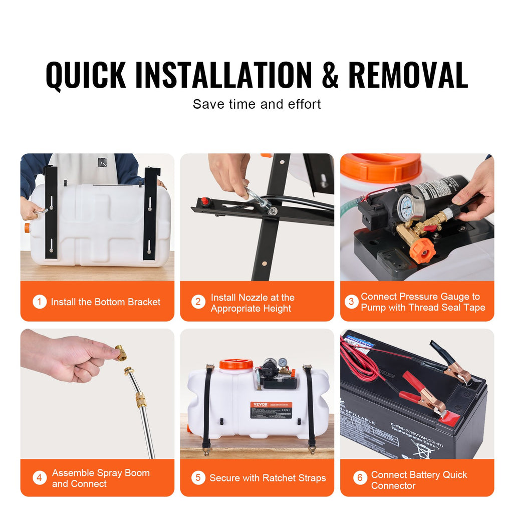 Smidzinātāju ātri un viegli uzstādīt vai noņemt lielākajai daļai ATV, UTV un traktoru modeļu. Sprādzes nodrošina stabilitāti, bet grope abās pusēs atvieglo transportēšanu. Vienkārša lietošana taupa laiku un spēkus, padarot to piemērotu gan profesionāļiem, gan hobijiem.