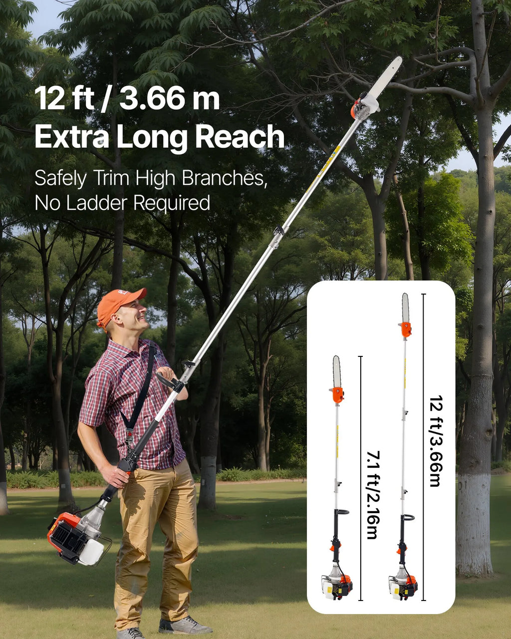 Jaudīgs sniegums: Aprīkots ar 43 cm³ 2-taktu benzīna motoru, teleskopiskais zāģis nodrošina 1,75 ZS jaudu un sasniedz līdz 12 000 apgr./min, nodrošinot ātru un efektīvu zaru griešanu. Divi 855 mm pagarinājuma stieņi ļauj regulēt darba garumu no 2,16 līdz 3,66 m, lai ērti aizsniegtu augstus zarus. Griešanas galva regulējama 90–180° diapazonā, nodrošinot elastību dažādiem griešanas leņķiem.
